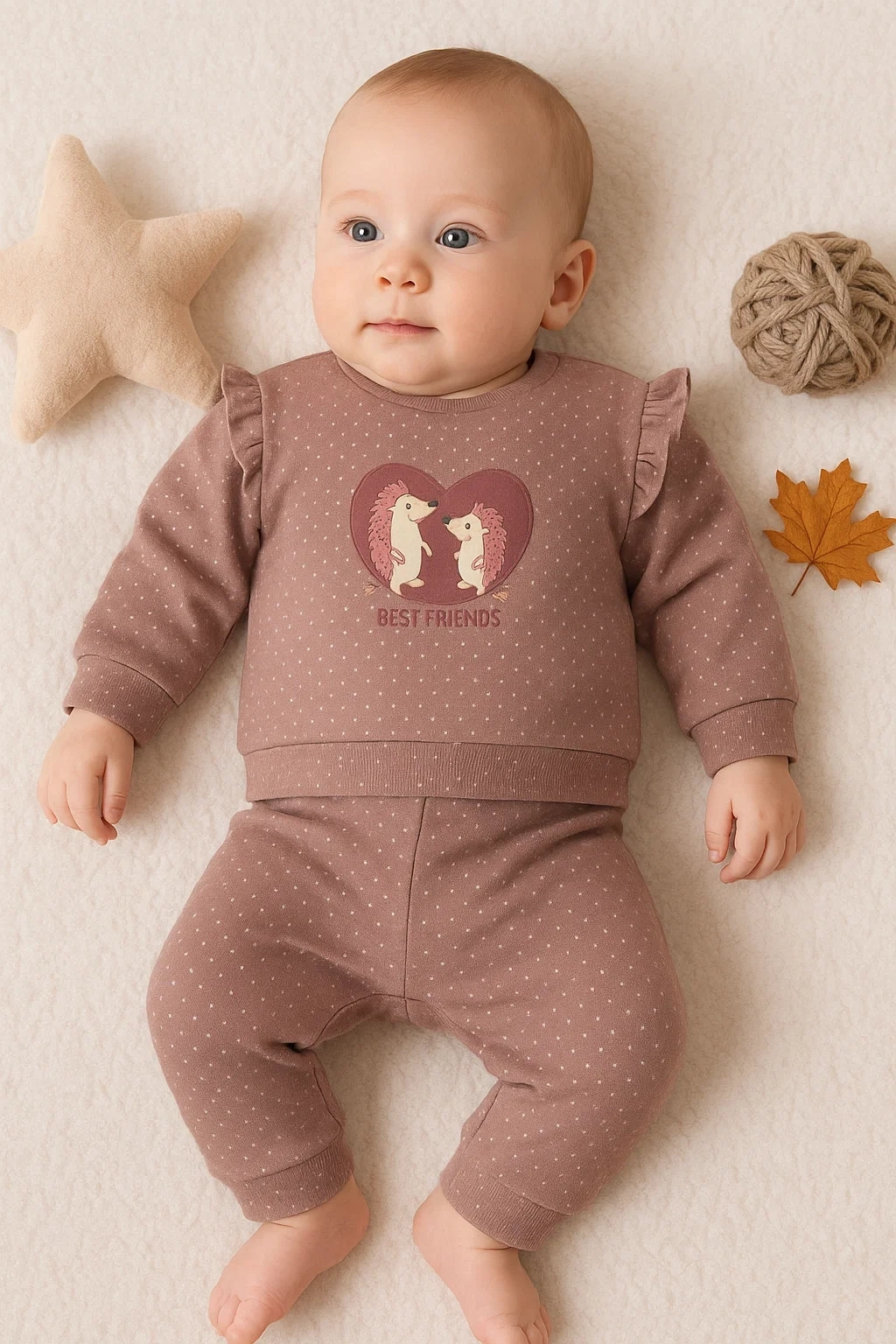 Kirpi Nakışlı % 100 Pamuk 2'li Kız Bebek Takım