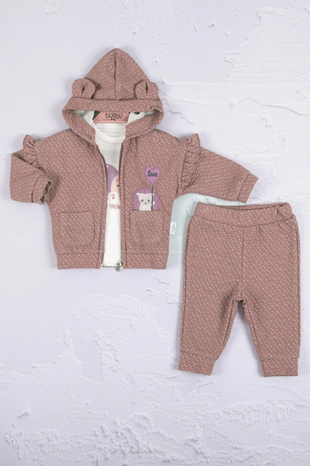Puan Desenli Kapişonlu % 100 Pamuk 3'lü Kız Bebek Takım
