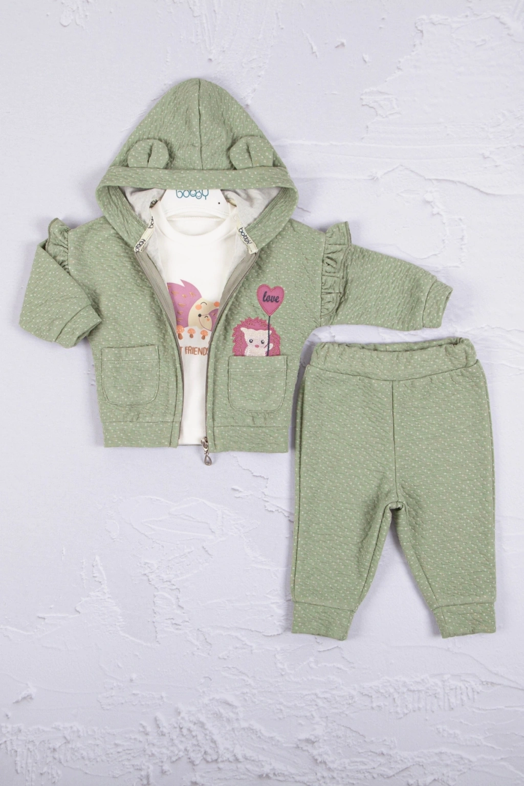Kirpi Nakışlı % 100 Pamuk 3'lü Kız Bebek Takım