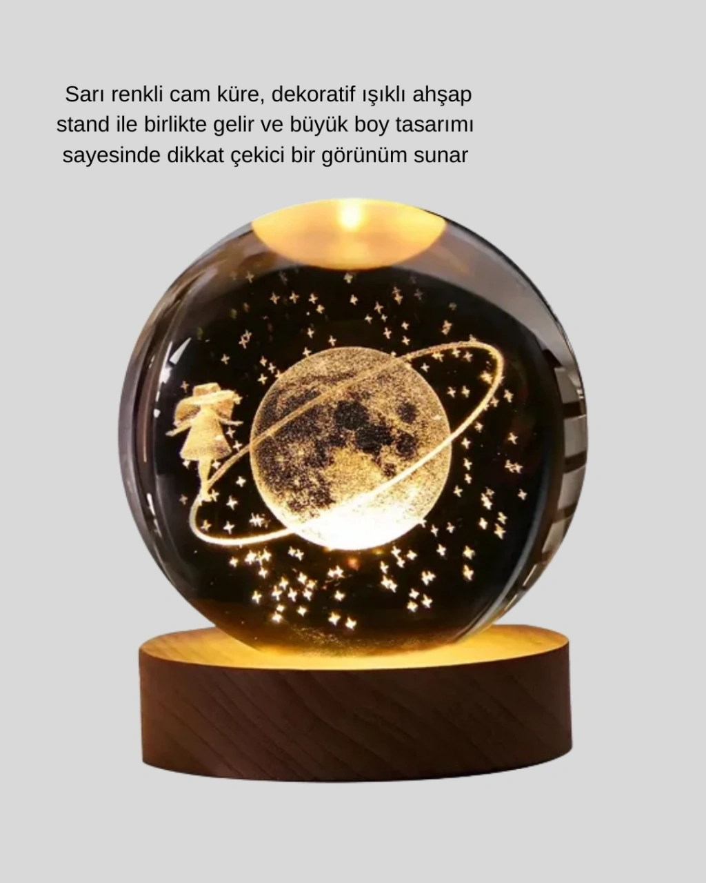 Dekoratif sarı ışıklı cam küre, şık tasarımı ve göz alıcı kız figürü ile mekanlarda benzersiz bir ambiyans oluşturur. Hem gece lambası hem de dekoratif obje olarak kullanılabilir. Ahşap standı, doğal malzeme dokusu ile küreye sıcak bir görünüm kazandırır. Büyük boy yapısı sayesinde raflarda, sehpalarda veya masa üstlerinde dikkat çekici bir dekoratif parça oluşturur. Yumuşak sarı ışığı ortama huzur verir ve sıcak bir atmosfer oluşturur.