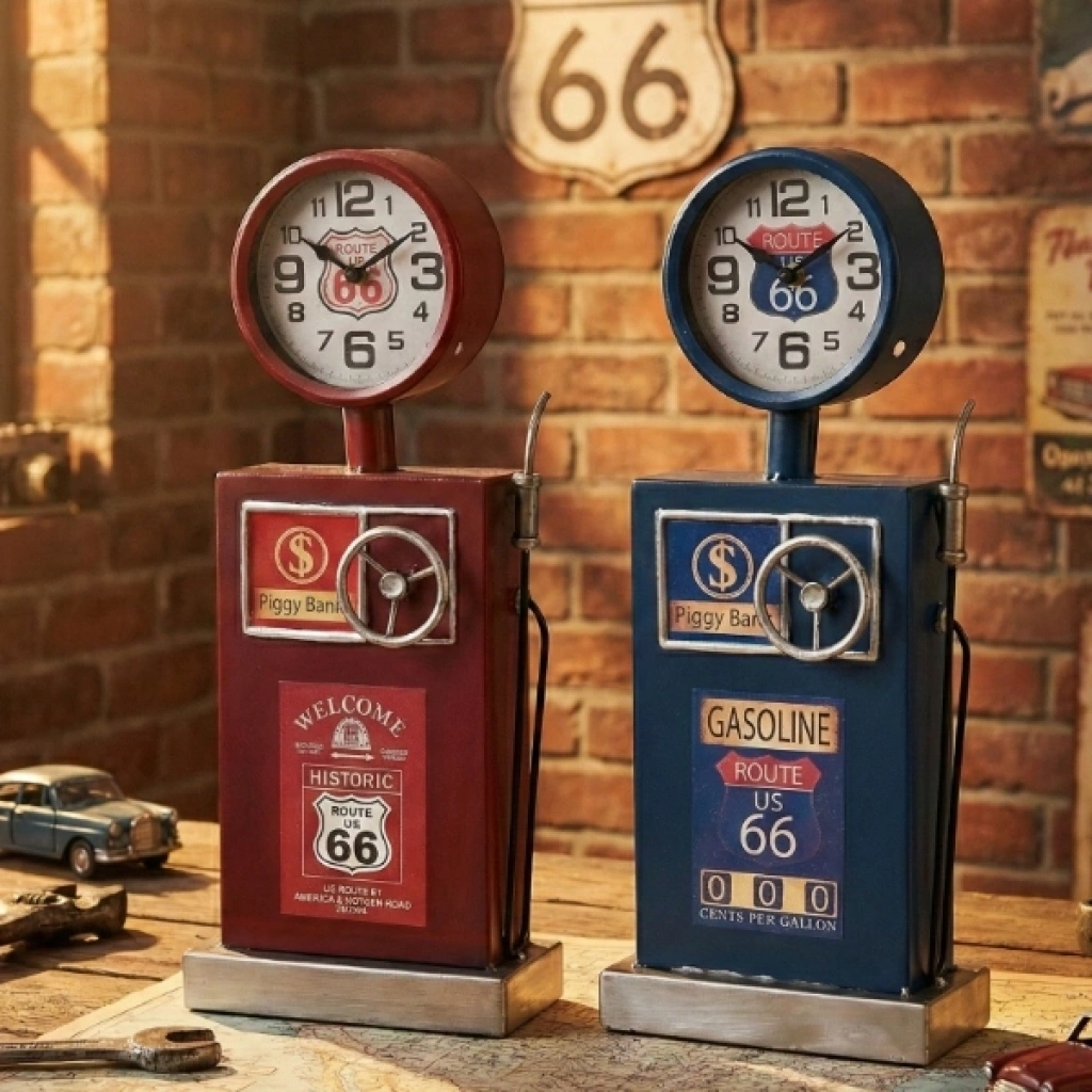 KLASİK BENZİNLİK TASARIMLI MASAÜSTÜ SAATÜrün ÖzellikleriKlasik benzinlik tasarımlı masaüstü saat, nostaljik benzin istasyonlarından ilham alan özgün gövde yapısı ve Route 66 temalı detaylarıyla dekorasyona karakter kazandıran özel bir modeldir. Dikey formu ve üst bölümde konumlandırılmış yuvarlak saat kadranı, klasik masa saatlerinden ayrışarak güçlü bir görsel etki oluşturur. Gövde üzerinde yer alan benzin pompası hortumu, vana ve retro grafik baskılar ürüne gerçekçi ve koleksiyonluk bir görünüm kazandırır. Net ve büyük rakamlara sahip analog kadranı sayesinde saat kolayca okunabilir ve hem dekoratif hem işlevsel bir kullanım sunar. 9x18x45 cm ölçüleriyle masa, raf, konsol, kitaplık veya vitrin üzerinde dikkat çekici bir duruş sergiler. Sessiz çalışan mekanizması sayesinde ofis, çalışma odası veya yaşam alanlarında rahatsız edici bir ses oluşturmaz. Dayanıklı malzemeden üretilmiş yapısı uzun ömürlü kullanım sağlar. Renk seçimi yapılamamaktadır; ürün kırmızı veya mavi renk seçeneklerinden biri olacak şekilde gönderilmektedir. Retro, vintage ve endüstriyel dekorasyon tarzlarını tamamlayan bu masaüstü saat, dekoratif obje arayanlar için ideal bir tercihtir.Paket İçeriği1 adet klasik benzinlik tasarımlı masaüstü saat