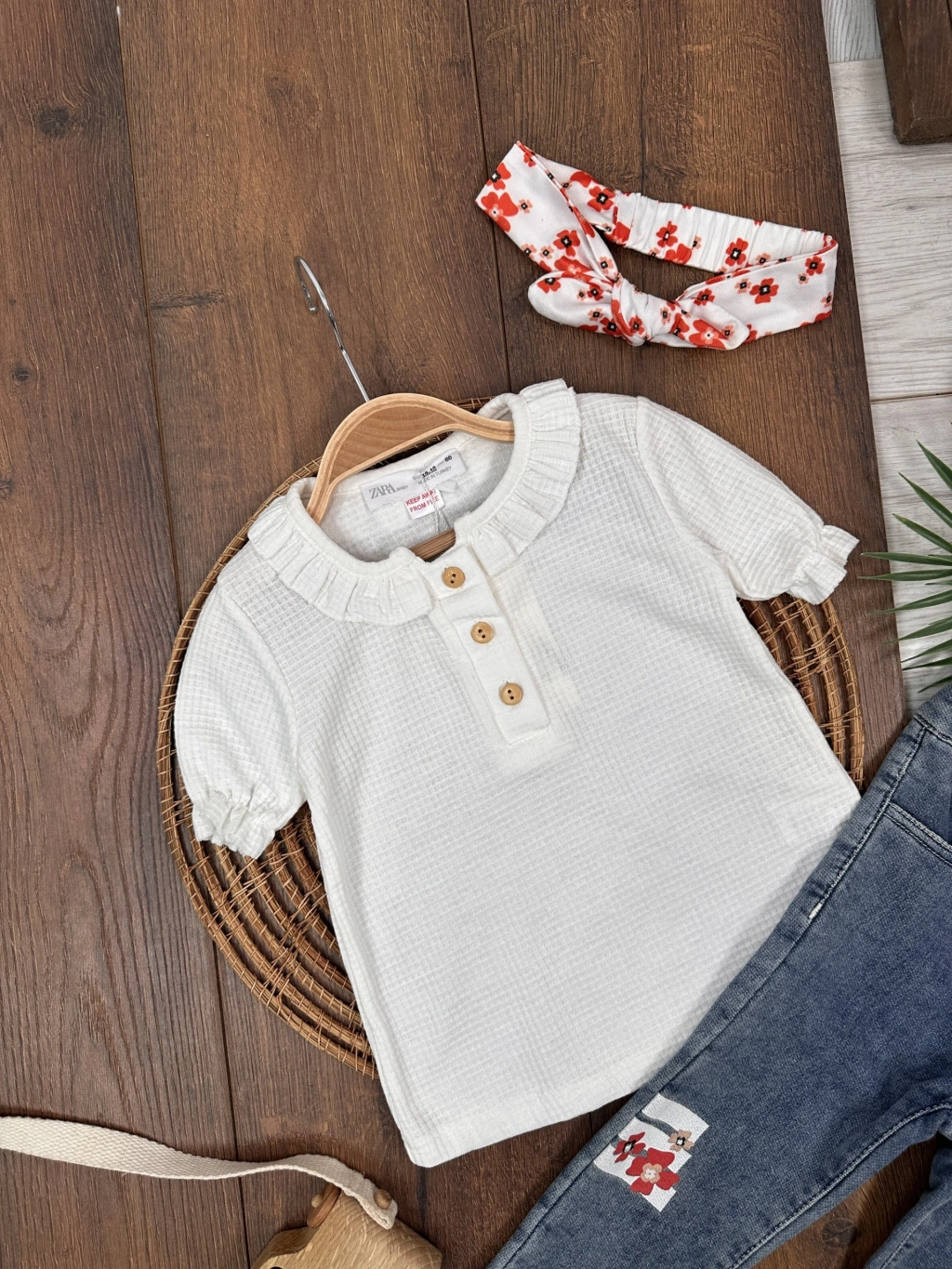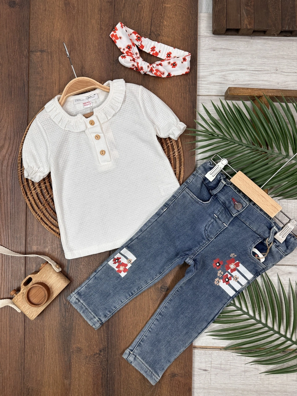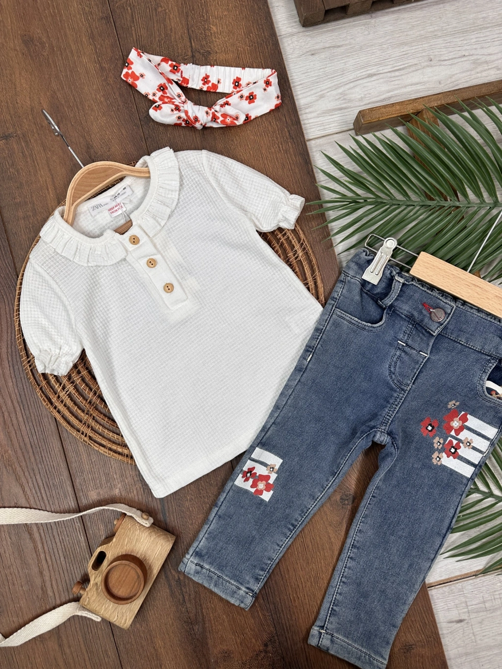 KREM BİSİKLET YAKA KISA KOLLU LASTİKLİ BEL KIZ ÇOCUK & BEBEK ALT ÜST TAKIM