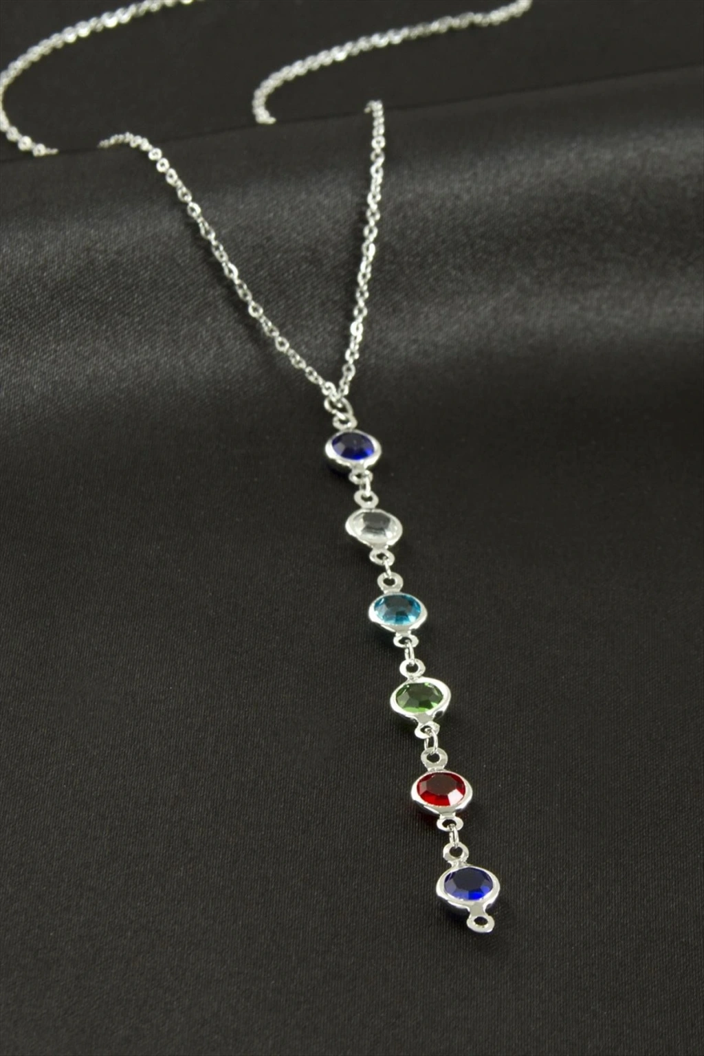 Kolye; Ürün malzemesi kristal taş ve çeliktir. Zincir uzunluğu 45 cmdir. Ürün ucunda sallantılı kristal taşlar vardır.