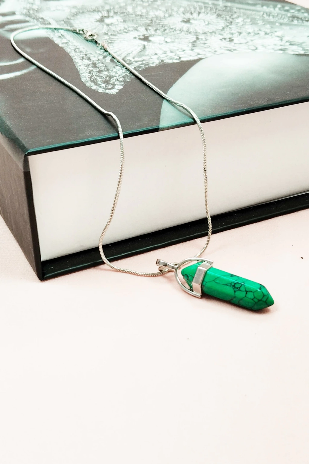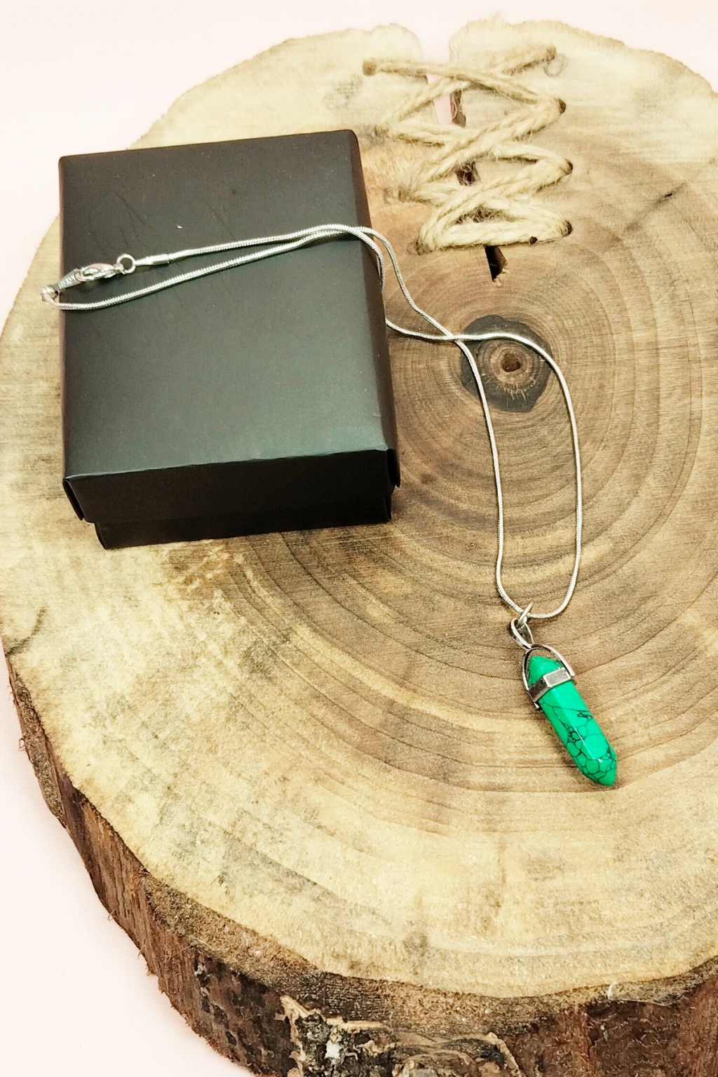 Yeşil Kuvars Doğal Taşı Zincirli El Yapımı Tasarımlı Kolye Uç: 3,5 cm Zincir: 20 cm Kutulu