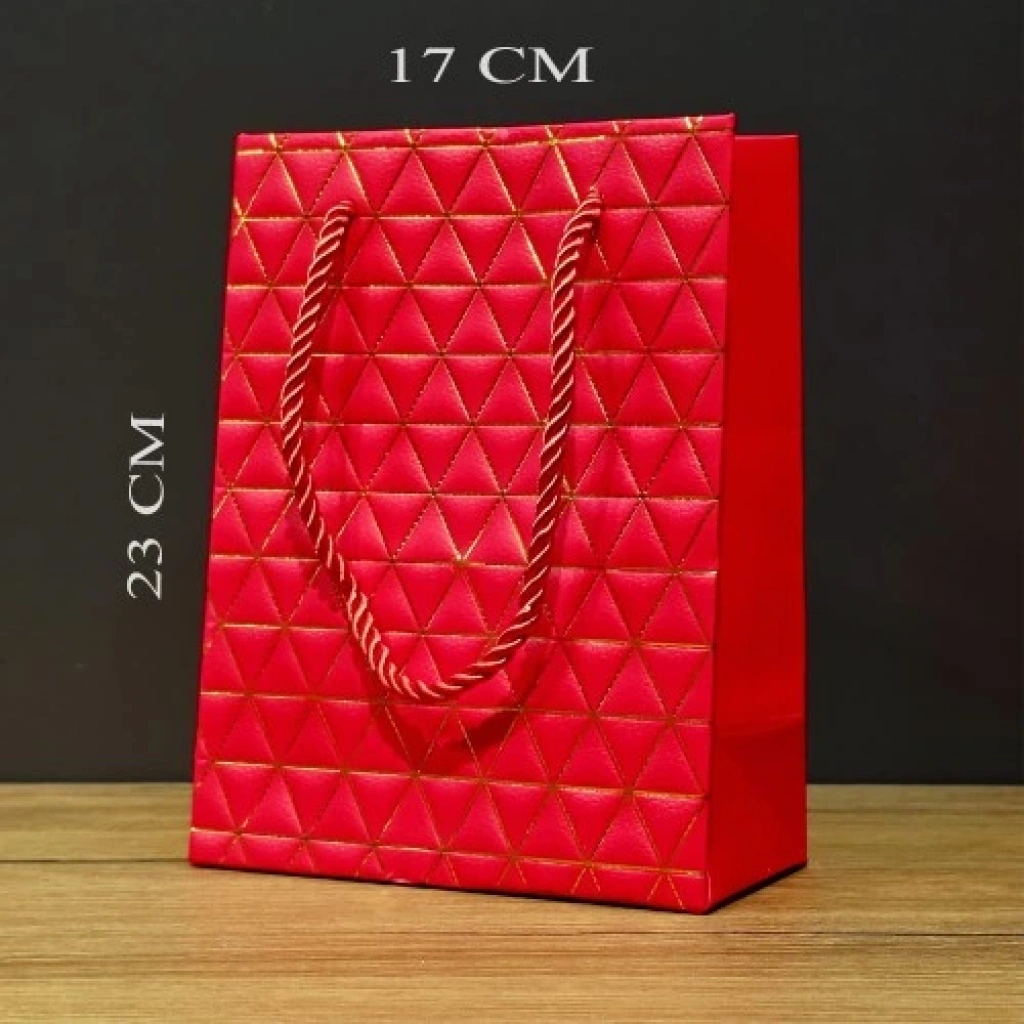 Küçük Boy Kırmızı Gold Renkli Karton ÇantaKüçük Boy Kırmızı Gold Renkli Karton Çanta, doğum günü, sevgililer günü, babalar günü gibi özel günlerde hediyenizi şık bir hediye çantası ile sunmanıza olanak sağlar.Küçük boy kırmızı ve gold renkli hediye çantası, şık tasarımı ve özel görünümü ile özel günlerin vazgeçilmez çantalarından biridir.Kırmızı renk ve gold desenli küçük karton mukavva çanta, üzerinde bulunan motif desenlerle estetik bir görünüme sahiptir.Küçük boy karton çanta, aldığınız hediyeleri şık bir sunumla vermenize yardımcı olur. Çantanın tasarımı günlük kullanım için de uygundur.İpli karton çanta, son zamanların trend hediye çantalarından biridir.Ürün Özellikleri:Malzeme: Kaliteli karton malzemeden üretilmiştir.Tasarım: Şık ve dekoratif bir çanta.Kullanım: Dekoratif veya hediye sunumunda kullanılabilir.Detaylar: Karton çanta üzerindeki desenler şık bir görünüm sağlar.Ürün Ölçüsü: 23 cm x 17 cm