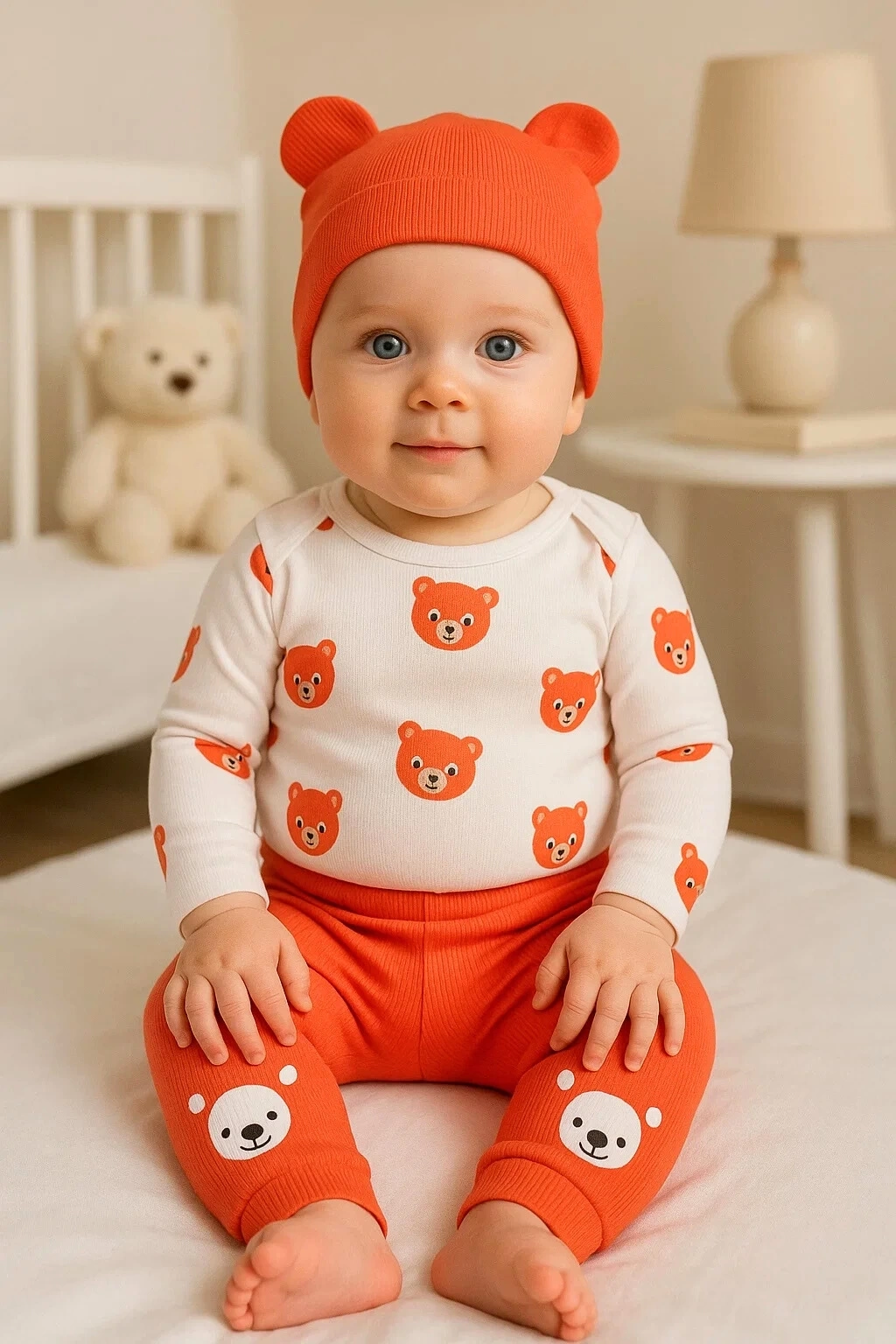 Kulaklı Ayıcık % 100 Pamuk 3'lü Erkek Bebek Takım.