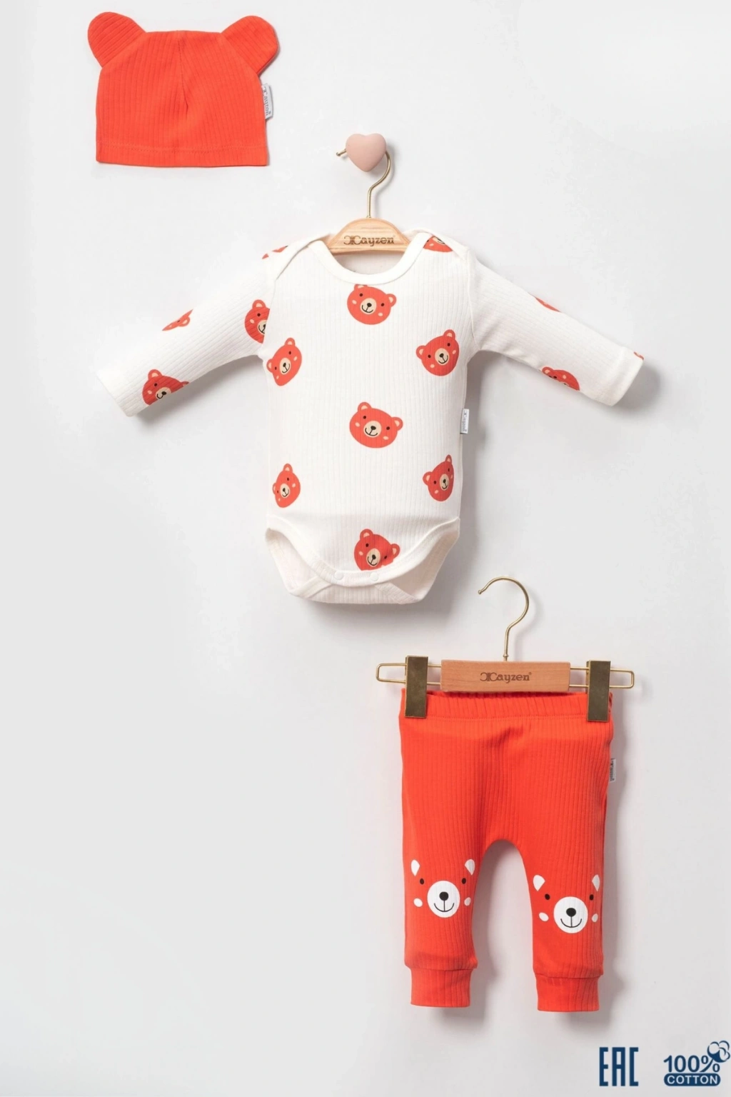 Kulaklı Ayıcık % 100 Pamuk 3'lü Erkek Bebek Takım
