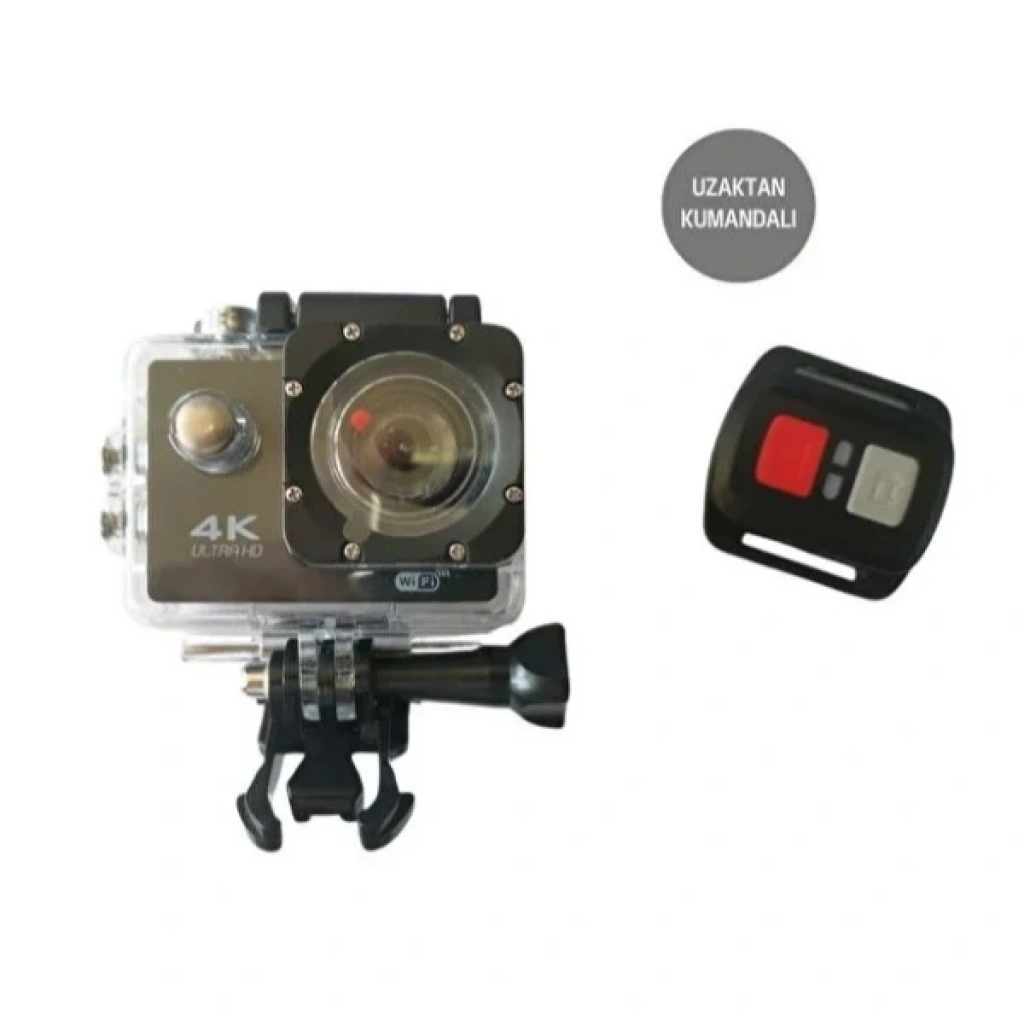 KUMANDALI 4K WI-FI AKSİYON KAMERASIÜrün ÖzellikleriKumandalı 4K Wi-Fi aksiyon kamerası, yüksek çözünürlüklü video ve fotoğraf çekimleriyle maceralarınızı ölümsüzleştirmek için tasarlanmıştır. 16 MP fotoğraf çözünürlüğü (4640x3480) ve 4K (3840x2160/30 fps) video kalitesi ile net ve canlı görüntüler elde edebilirsiniz. Geniş 170° açıya sahip lensi sayesinde her detayı yakalar. 30 metreye kadar su geçirmez kasası, dalış, yüzme ve yağmurlu hava çekimleri için mükemmel bir dayanıklılık sağlar. Kompakt boyutları (8,5x7x4 cm) ve 130 gr hafifliğiyle taşınması kolaydır. 900 mAh şarjlı Li-ion batarya ile yaklaşık 60 dakika kullanım süresi sunar ve ortalama 3 saatte tamamen şarj olur. Micro SDHC/SDXC kart desteği 64 GB’a kadar genişletilebilir depolama alanı sunar (kart dahil değildir). Micro HDMI ve micro USB bağlantı noktalarıyla veri aktarımı hızlı ve pratiktir. Wi-Fi özelliği sayesinde çekimlerinizi anında mobil cihazınıza aktarabilirsiniz.Paket İçeriği1 adet 4K Wi-Fi aksiyon kamerası1 adet uzaktan kumanda1 adet su geçirmez koruma kılıfı 1 adet USB şarj kablosu1 adet bağlantı atı seti