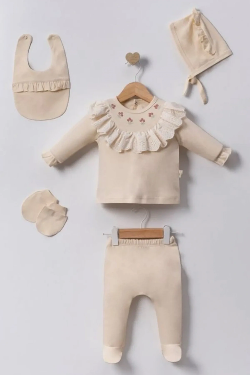 Omuzdan Fırfır Detaylı 5 parça %100 Pamuk Kız Hastane Çıkışı