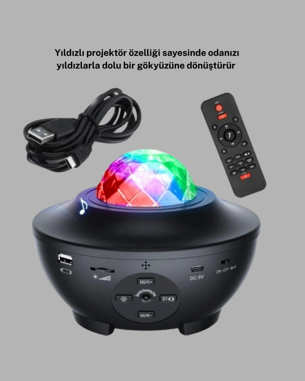 Yıldızlı projektör, evinizi gökyüzüyle buluşturan ve özel anlarınıza büyülü bir hava katan güçlü bir atmosfer aydınlatma cihazıdır. Yıldız efektleri ve galaksi görünümü sayesinde duvarlarda ve tavanda benzersiz bir görsel şölen oluşturur. Farklı renk seçenekleri ile odanın havasını saniyeler içinde değiştirebilir, ister huzurlu ister enerjik bir ambiyans yaratabilirsiniz.Projektörün ayarlanabilir parlaklık seviyeleri, kullanıcıya tam kontrol imkânı sunar. Loş bir gece ışığı, dinlendirici bir meditasyon ortamı veya etkileyici bir parti atmosferi… Hepsi tek bir cihazla mümkündür. Renkli ışık kombinasyonları çocuklar için masalsı bir uyku ortamı oluştururken yetişkinler için es ve şık bir dekoratif aydınlatma sunar.Cihazın kullanım kolaylığı sayesinde her yaş grubu rahatlıkla kullanabilir. Üzerindeki butonlarla renk modu, parlaklık seviyesi ve galaxy efekti hızlı şekilde değiştirilebilir. Hafif ve taşınabilir olması, projektörü ev içinde dilediğiniz yere taşımanızı sağlar. Yatak odası, salon, çalışma odası, çocuk odası, parti ortamı gibi pek çok alanda kullanılabilir.LED ışık teknolojisi, düşük enerji tüketimiyle uzun süreli kullanım sağlar. Ayrıca düşük ısı yaydığı için güvenli bir kullanım deneyimi sunar. Sessiz çalışma özelliği, uyku ve meditasyon sırasında rahatsızlık yaratmaz.Hem dekorasyon hem fonksiyon olarak ön plana çıkan yıldızlı projektör, yaşam alanlarınıza modern, etkileyici ve rahatlatıcı bir ışık atmosferi katar. Özel günlerde, romantik anlarda veya çocukların uyku saatlerinde kullanabileceğiniz çok yönlü bir aydınlatma çözümüdür.