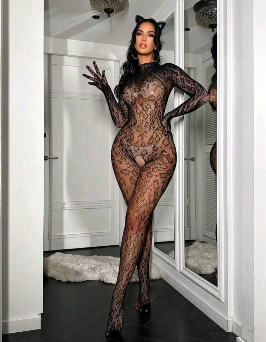 Siyah Çiçek Desenli Transparan Vücut Çorabı,Seksi Uzun Tulum Fantazi İç Giyim