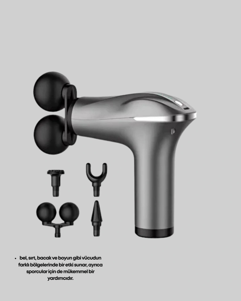 Şarjlı 4 başlıklı masaj tabancası, kas gerginliğini azaltmak ve vücudu rahatlatmak için geliştirilmiş çok yönlü bir masaj aletidir. Vücudun bel, sırt, boyun, bacak gibi çeşitli bölgelerinde etkili sonuçlar sunar. Günün yorgunluğunu atmak veya spor sonrası kasları rahatlatmak isteyen herkes için ideal bir çözümdür.Cihazla birlikte gelen dört farklı başlık, farklı kas grupları için özel olarak tasarlanmıştır. Büyük kas gruplarında geniş yüzeyli başlık tercih edilirken daha küçük kas bölgelerinde dar uçlu başlıklar ideal performans sağlar. Bu sayede kullanıcı kendi masaj deneyimini ihtiyaçlarına göre şekillendirebilir.Titreşim teknolojisiyle çalışan cihaz, kas derinlerine ulaşıp etkili bir gevşeme sağlar. Kas sıkışmalarını, gerginliği ve sertliği hafifletmek için kullanılabilir. Sporcular için antrenman sonrası toparlanmayı hızlandıran güçlü bir yardımcıdır.Şarjlı yapısı, cihazı tamamen kablosuz kullanma özgürlüğü sunar. Hem taşınabilir hem hafif olması sayesinde çantaya konulabilir ve her yerde kullanılabilir. Ev, ofis, spor salonu, seyahat gibi tüm ortamlarda pratik kullanım sağlar.Çoklu hız ayarı, masaj yoğunluğunu tamamen kullanıcı kontrolüne bırakır. İster hafif bir gevşeme ister güçlü bir kas masajı yapmak istiyor olun, cihaz her ihtiyaca uygun performans sunar.Ergonomik tasarımı elde rahat kavrama sağlar ve uzun süre kullanımda bile yorgunluk oluşturmaz.Günlük stres, yoğun iş temposu, spor sonrası kas ağrıları gibi durumlarda vücuda hızlı bir rahatlama sunan bu masaj tabancası, fonksiyonelliği ve es tasarımıyla öne çıkan etkili bir kişisel bakım ürünüdür.