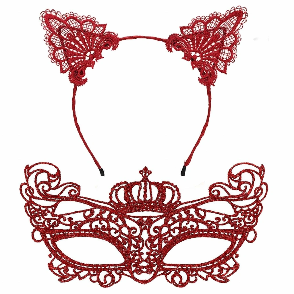 Lüks Kırmızı Dantel Taçlı Maske Seti 2 No - Parti, Balo, Kostüm Aksesuarı