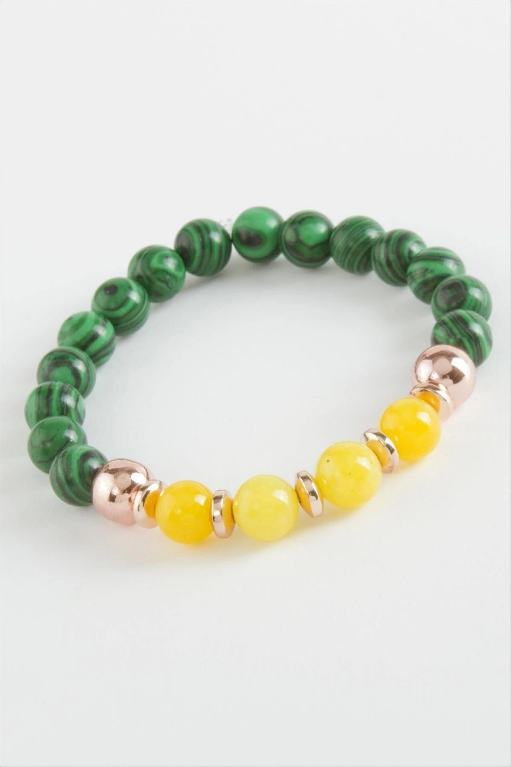 Bileklik: Ürün malzemesi malahit ceyt doğaltaşından imal edilmiştir. Misina üzerine dizilmiş ve esneme özelliği bulunmaktadır.