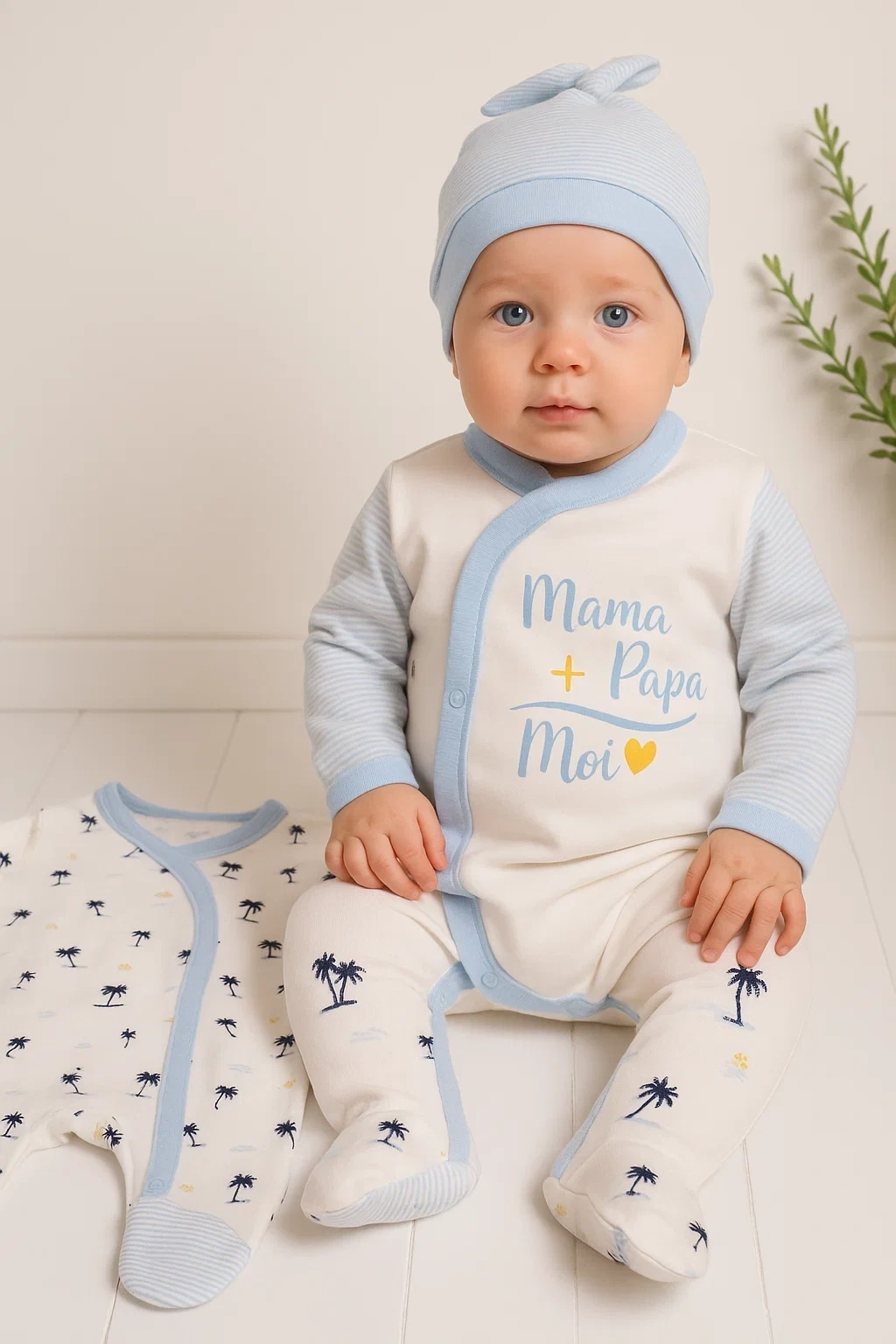 Araba Desenli Mavi 2'li Şapkalı Erkek Bebek Tulumu
