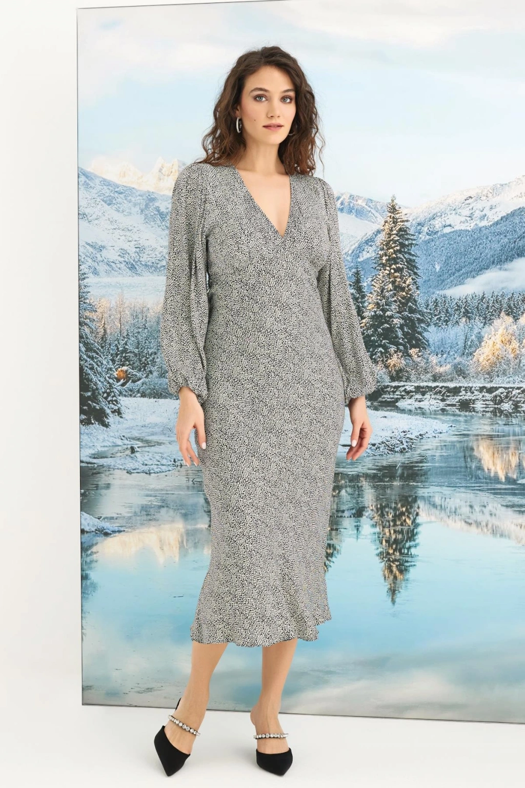 MARSiLYAN- %100 Viskon Desenli Uzun Kollu Saten Elbise