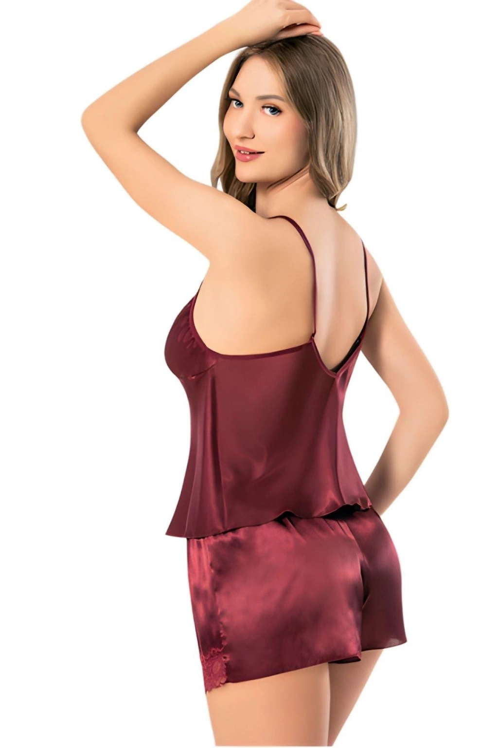 Luna Lora Crimson Lace Glow Kırmızı İnce Askılı Dantel İşlemeli Arkası Dekolteli Saten Gecelik