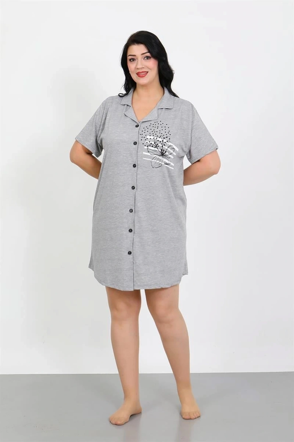 Çamaşır Kenti'nin şık ve rahat Büyük Beden Penye Düğmeli Gri Tunik Gecelik, gecelerinize konfor ve şıklık katıyor.