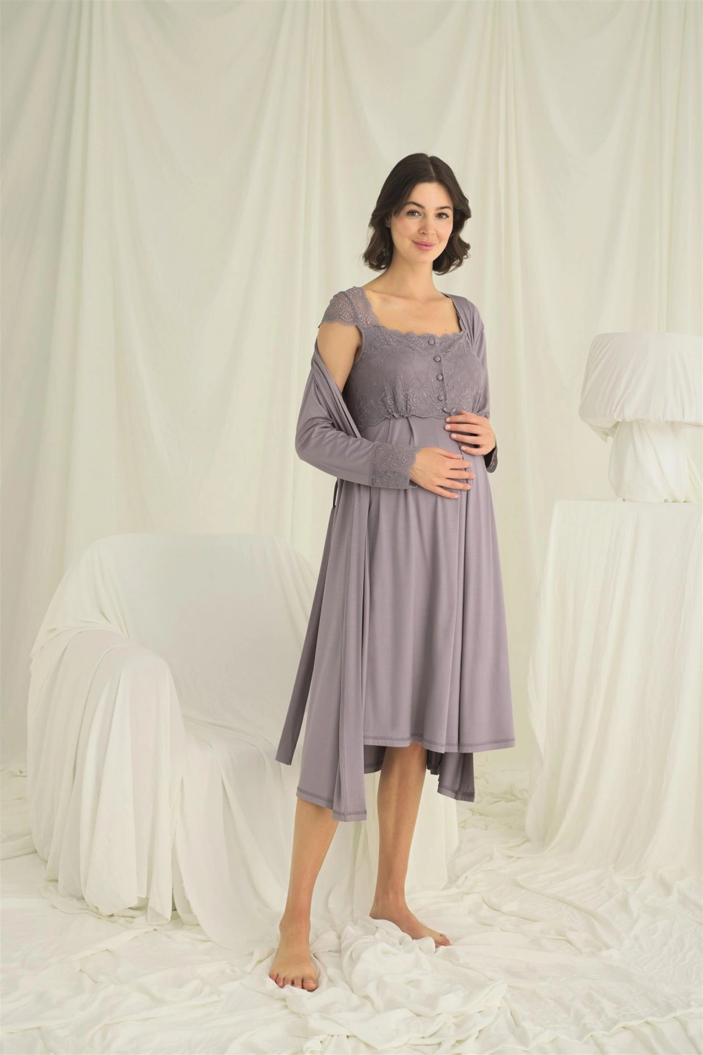 Dantelli Önü Düğmeli Hamile Lohusa Sabahlık Takımı