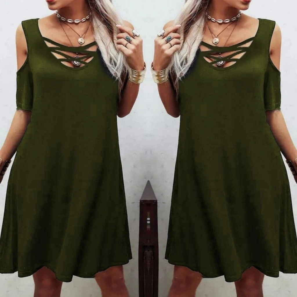 Dekolteli Bağcık Detay Viskon Kumaş Elbise