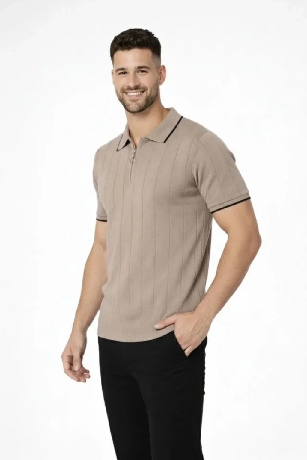 Erkek 3’lü Paket Dokuma Triko Fermuarlı Yakalı Fitilli Kısa Kollu Regular Fit Tişört - Kahverengi, Haki, Siyah