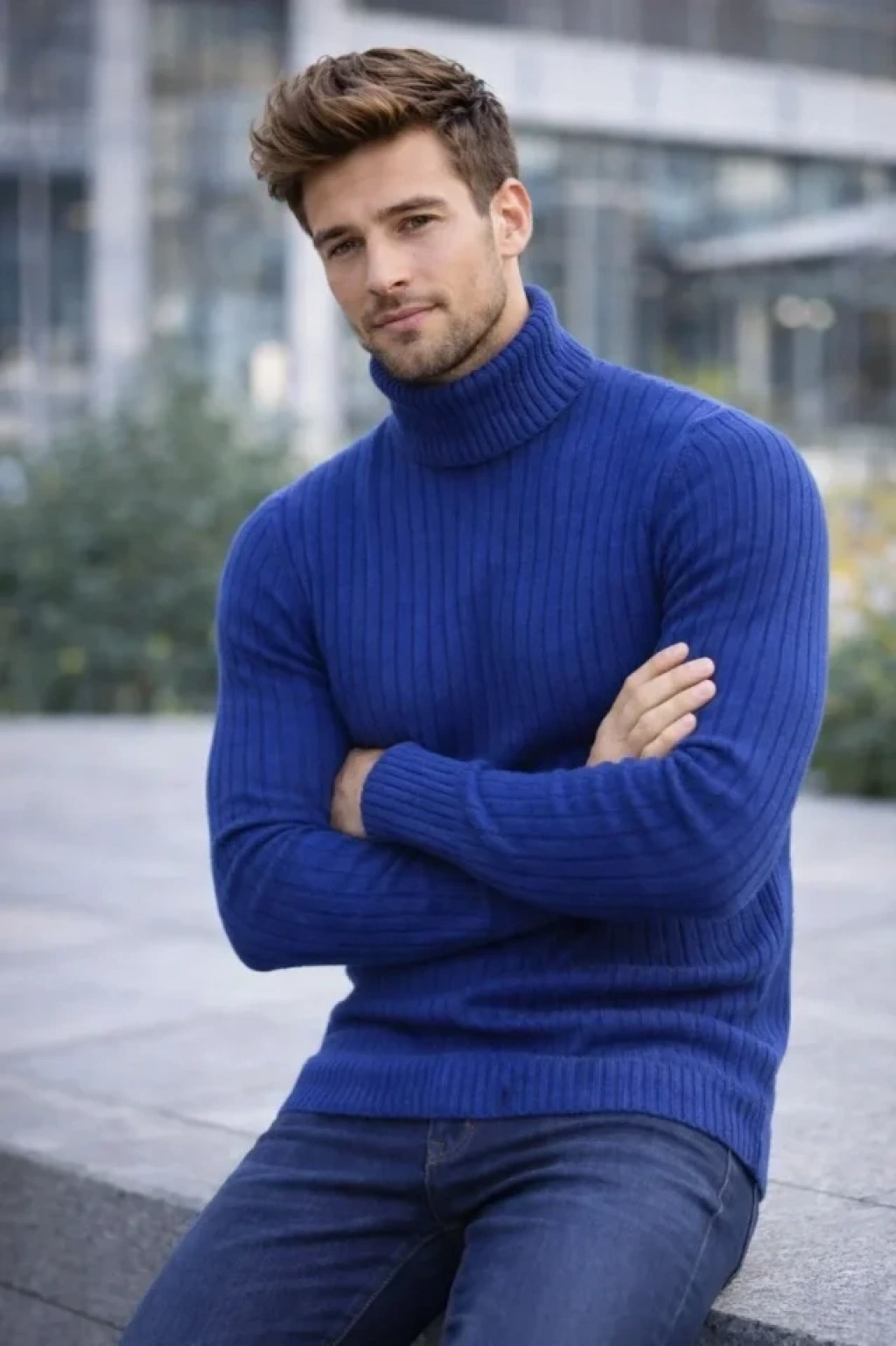 MARSiLYAN- Erkek Balıkcı Yaka Bağazlı Triko Kazak Pamuklu Kalın Fitilli Dokuma, Regular Fit Uzun Kollu Kışlık Model - İndigo