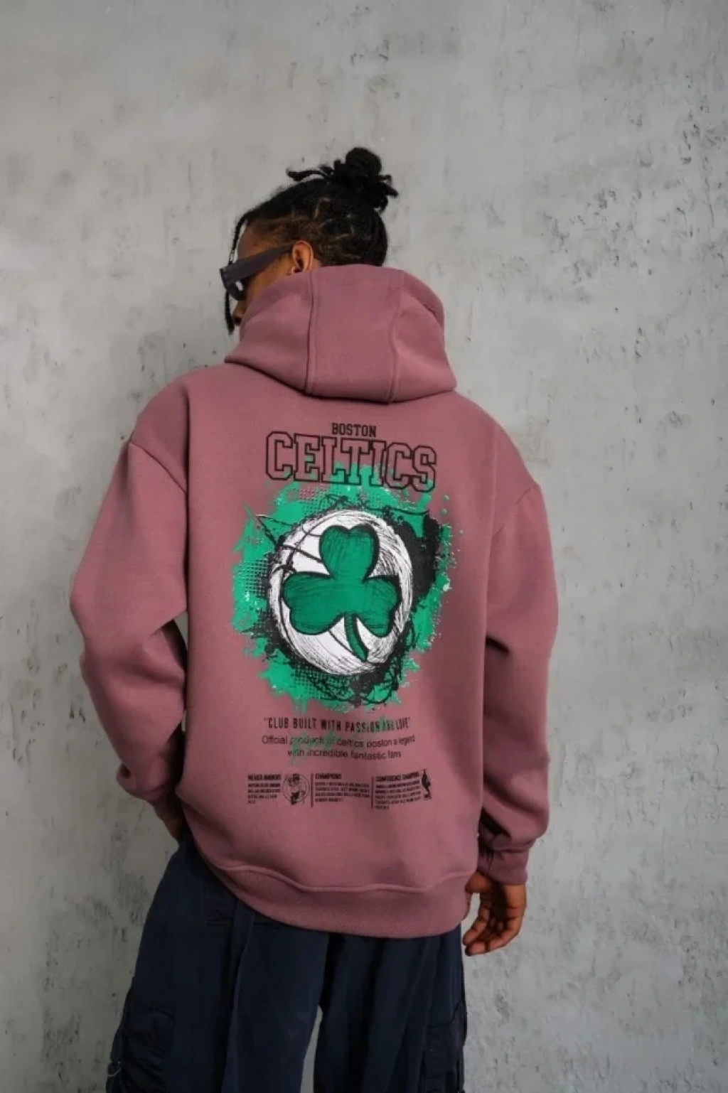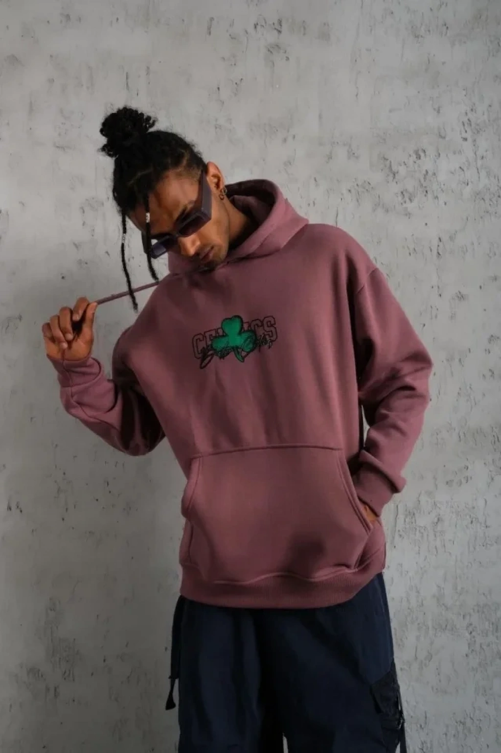 Erkek Baskılı Kapüşonlu Ve Kordon İpli Sweat - Gül Kurusu