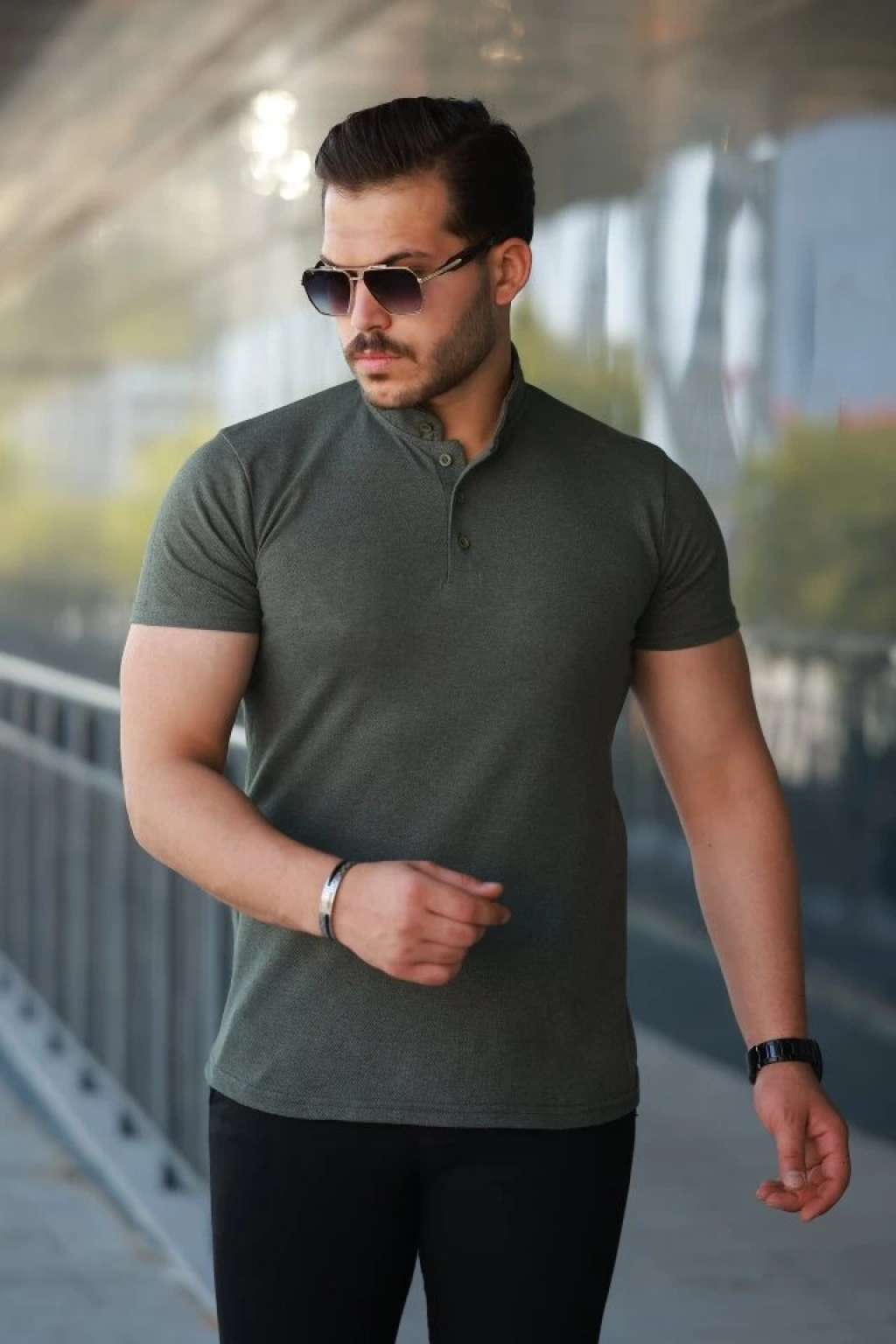 MARSiLYAN- Erkek T-shirt Çizgili Triko Dokuma Kumaş Polo Yaka Yarım Fermuarlı Regular Kalıp Tişört - Çağla Yeşili
