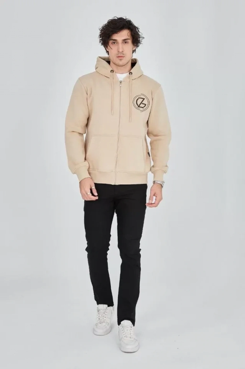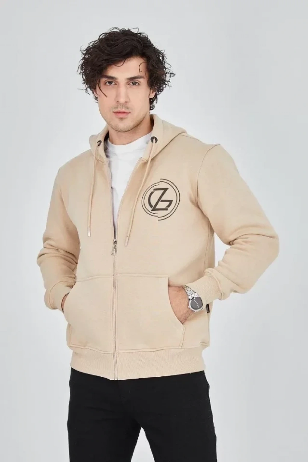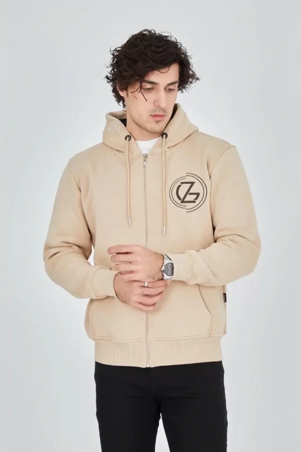 Erkek Kapüşonlu Baskılı Fermuarlı Hırka - Bej