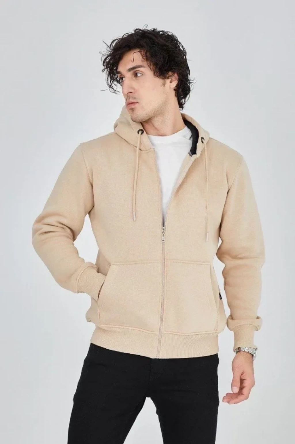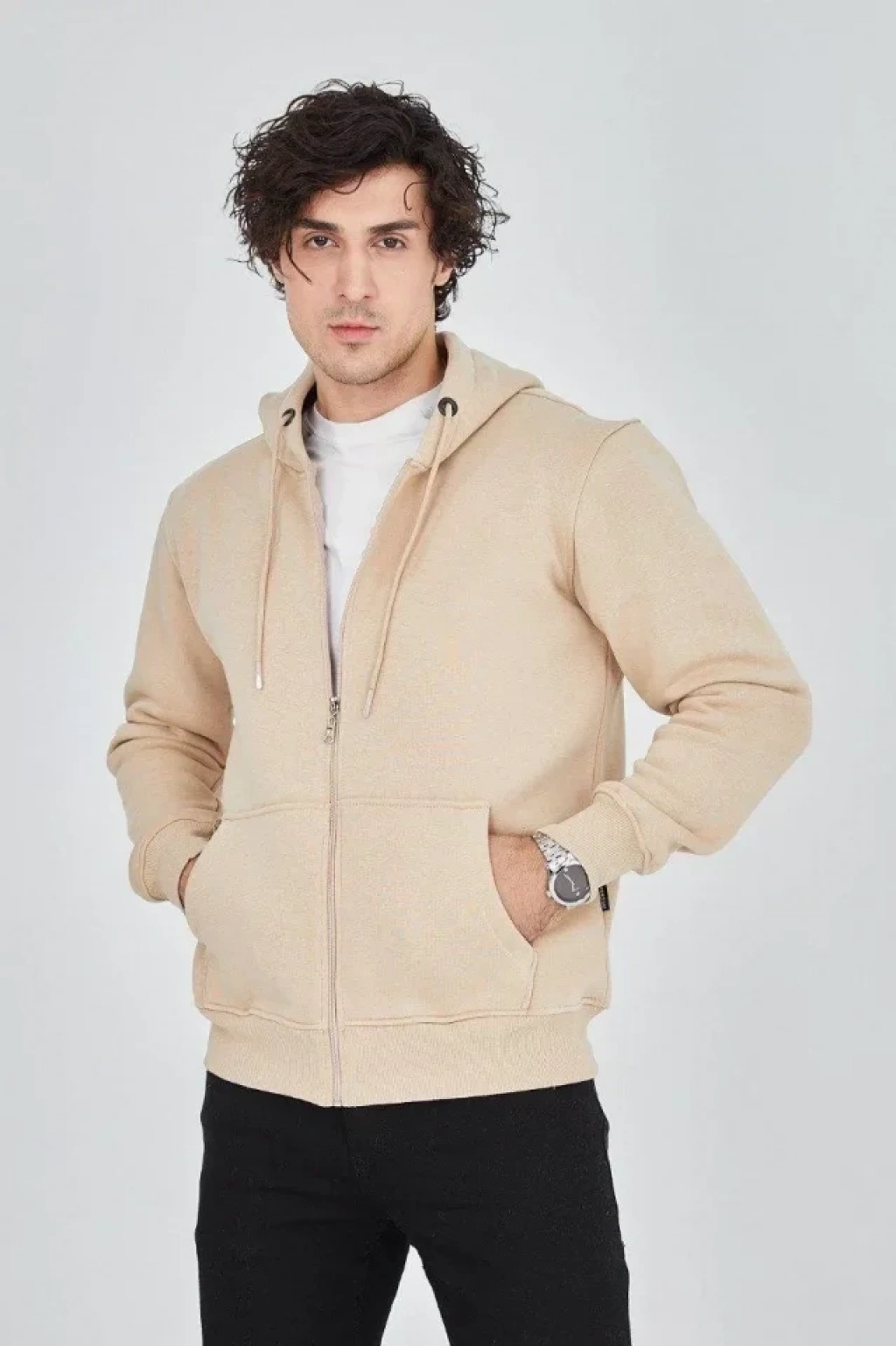 Erkek Kapüşonlu Düz Fermuarlı Hırka - Bej
