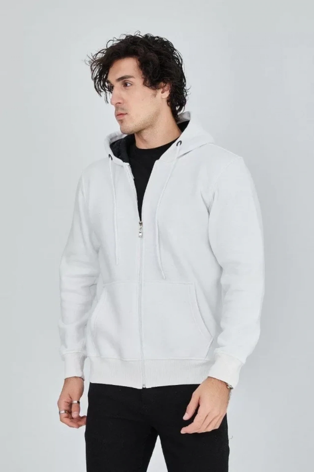 Erkek Kapüşonlu Düz Fermuarlı Hırka - Beyaz