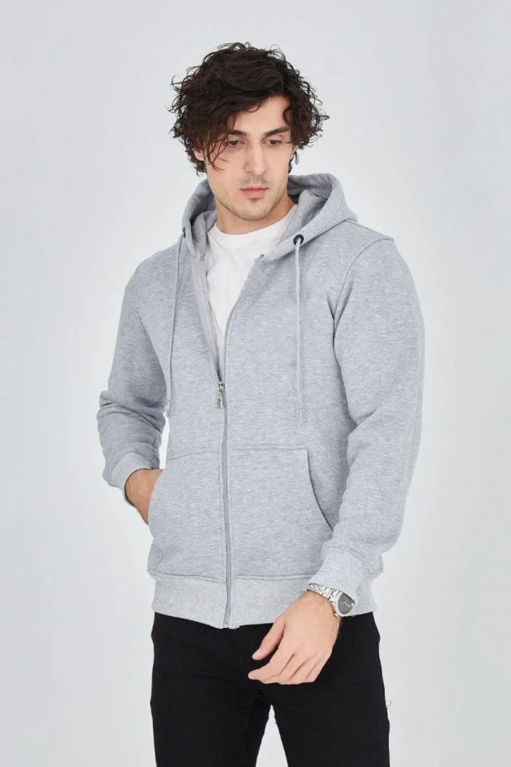 Erkek Kapüşonlu Düz Fermuarlı Hırka - Gri