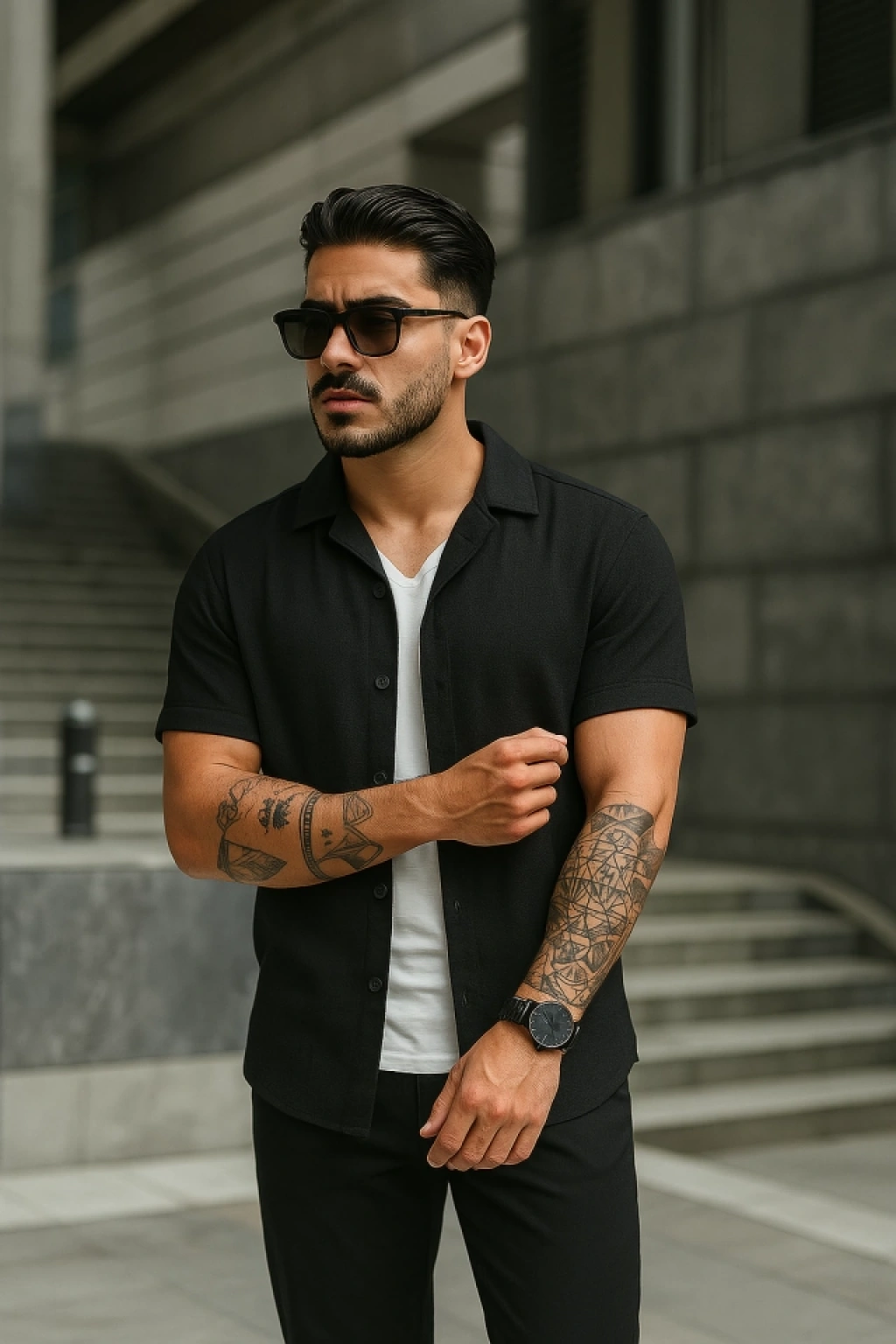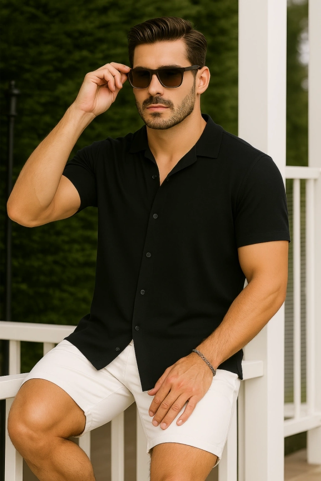 MARSiLYAN- Erkek Waffle Kumaş Kısa Kollu Gömlek Şort Takım Regular Fit Yazlık İkili Set - Siyah