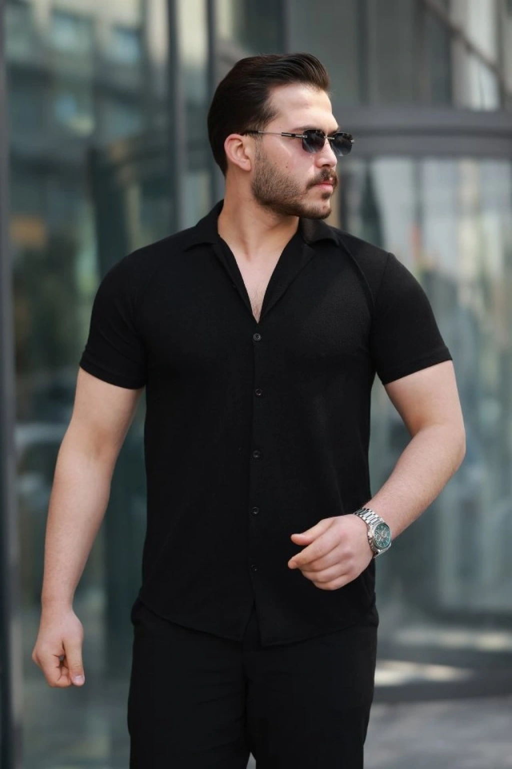 MARSiLYAN- Erkek Waffle Kumaş Kısa Kollu Düğmeli Açık Yaka Regular Fit Gömlek - Siyah