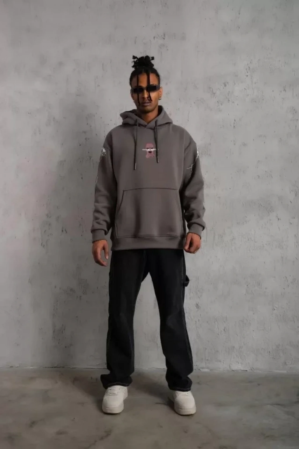 Erkek Maske Baskılı Kapüşonlu Sweat - Gri