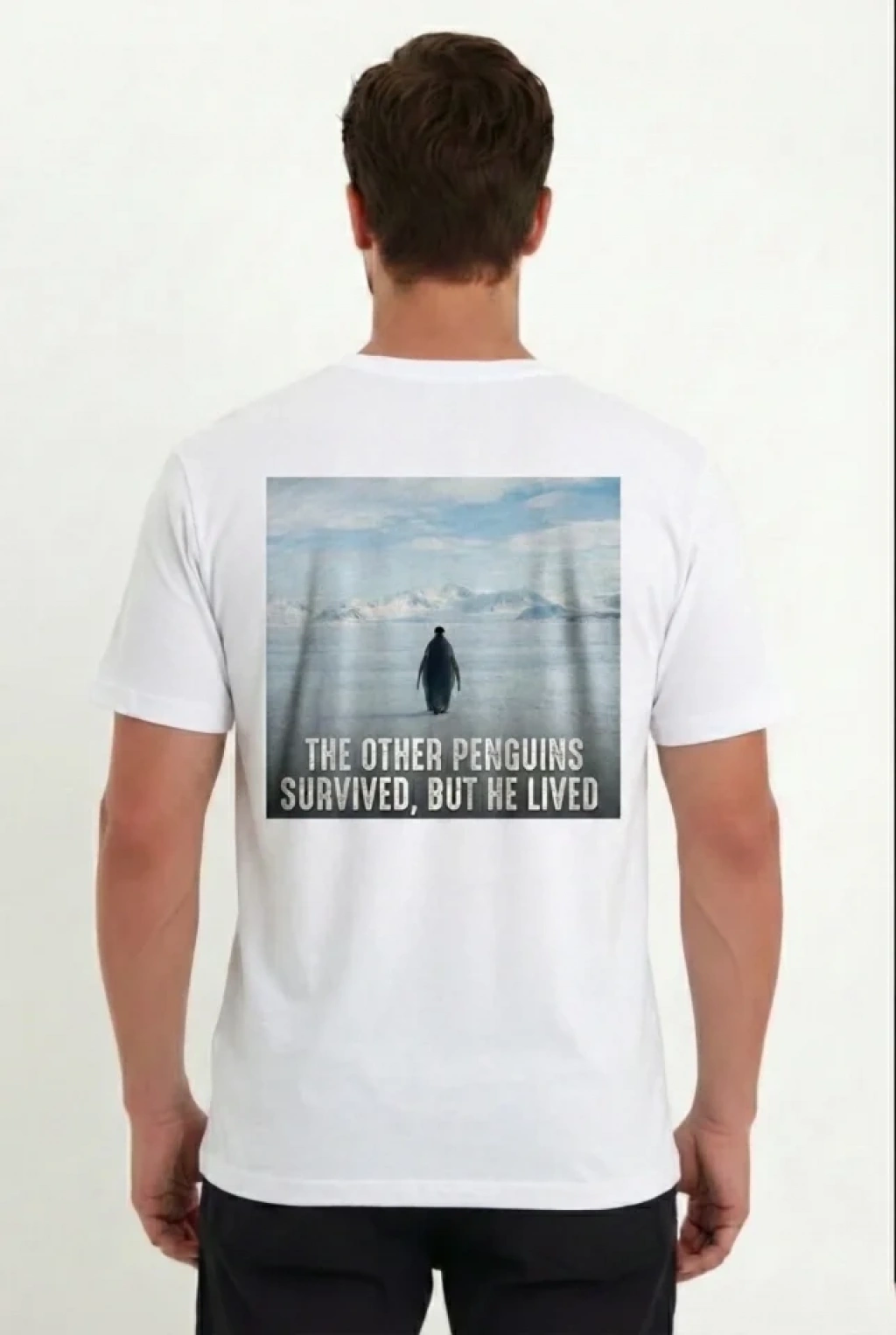 Erkek Oversize Tişört - Sırt Baskılı Survivor Penguin Temalı, Felsefi Yazılı Bisiklet Yaka Tişört - Beyaz