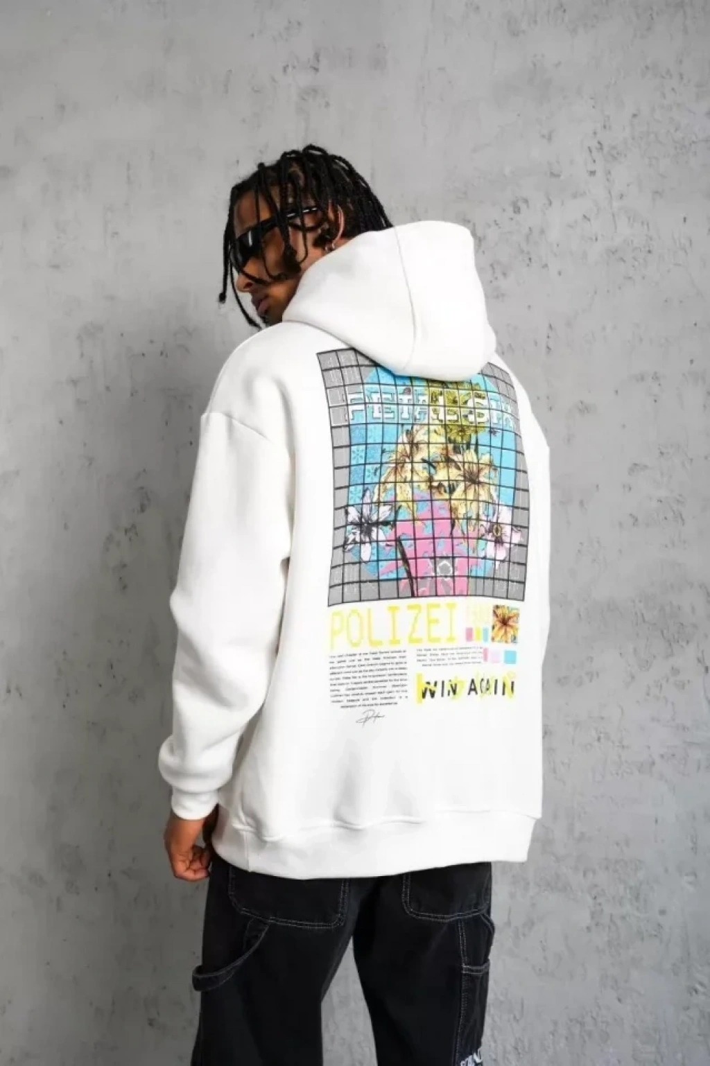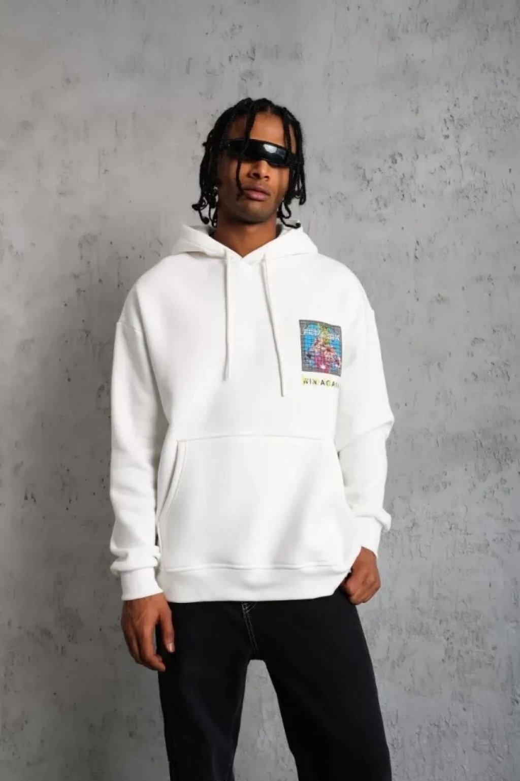 MARSiLYAN- Erkek Şapkalı Güvercin Baskılı Kapşonlu Sweat - Beyaz