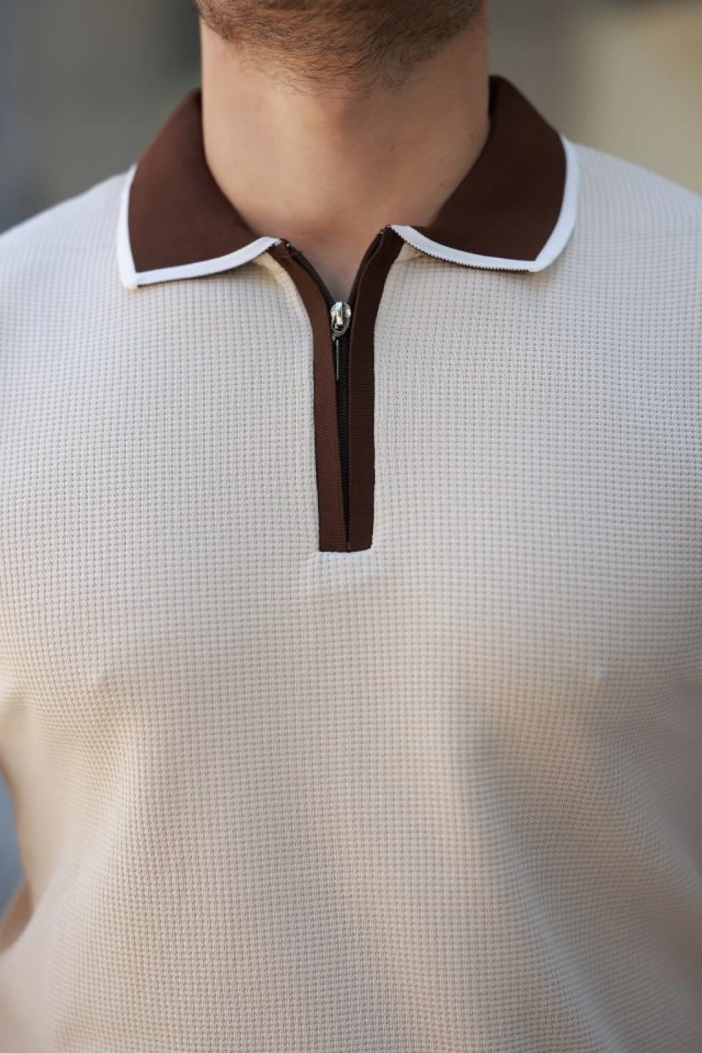 MARSiLYAN- Erkek T-shirt Çizgili Triko Dokuma Kumaş Polo Yaka Yarım Fermuarlı Regular Kalıp Tişört - Beyaz