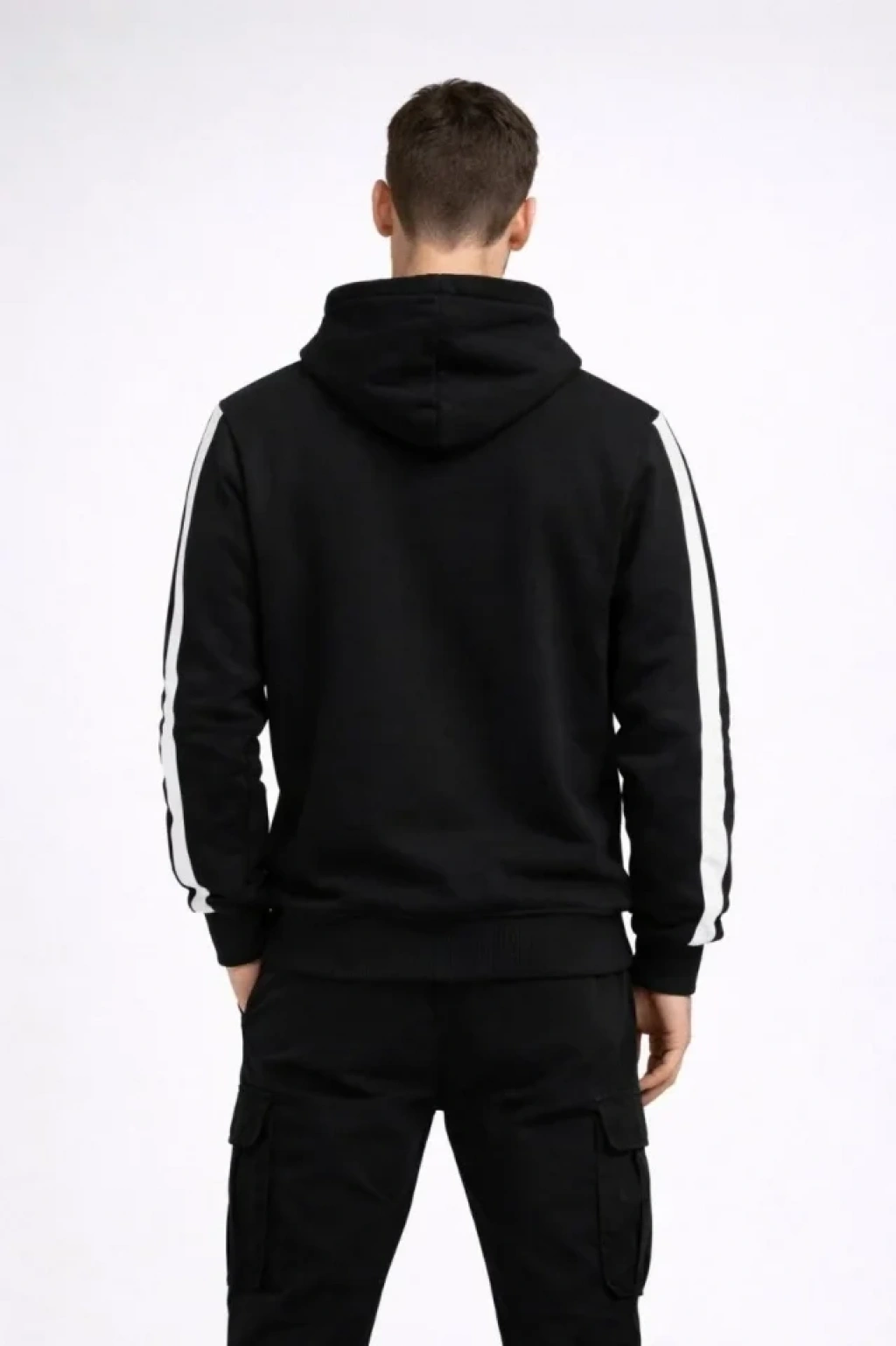 MARSiLYAN- Erkek Şeritli Kapüşonlu Sweatshirt Oversize 3 Iplik Pamuklu - Siyah