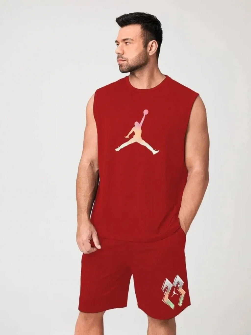Erkek Sırt Baskılı Sıfır Kol İkili Şort Takım - Kırmızı