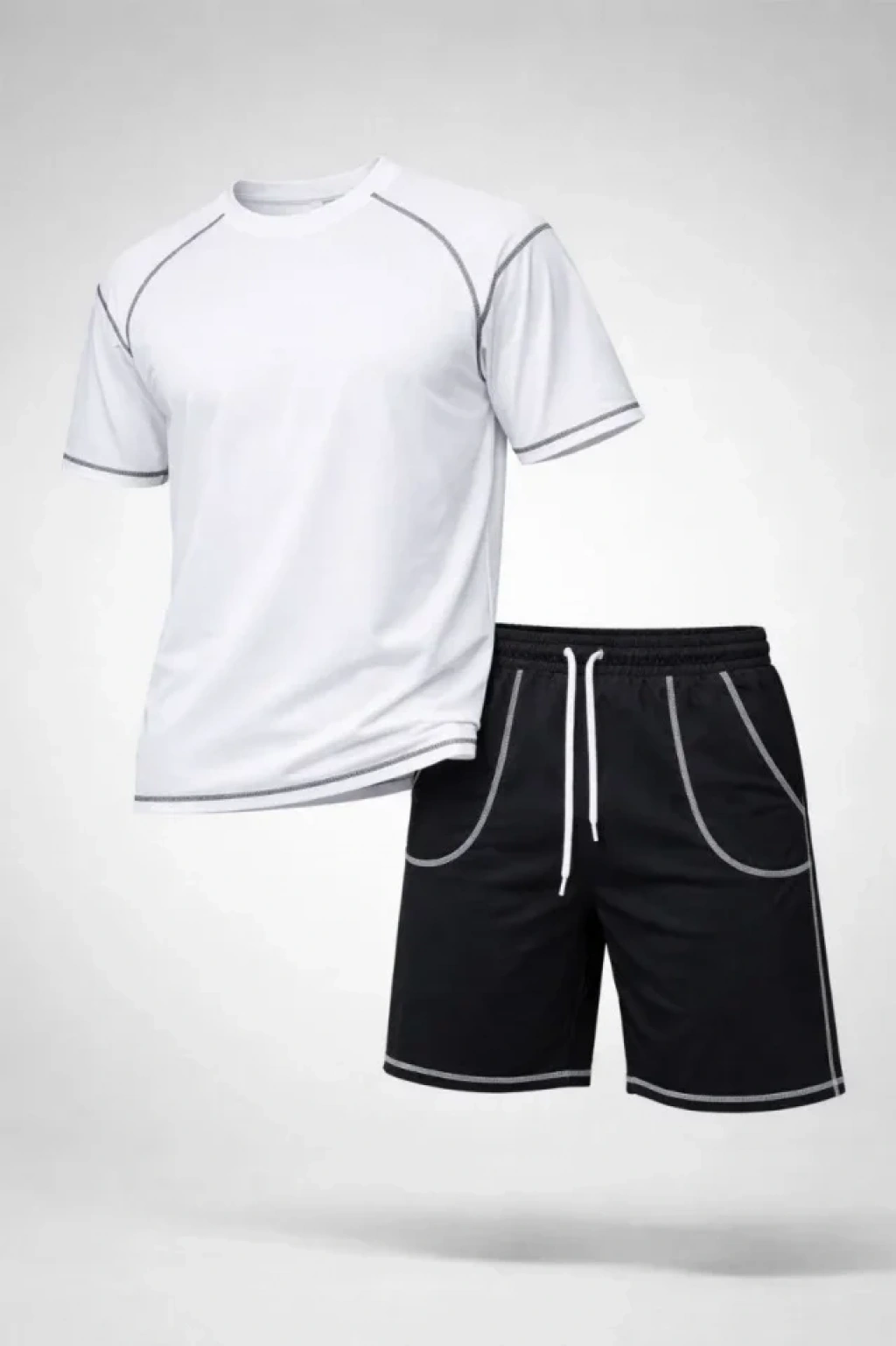 Erkek Spor Tişört Şort Takım Kontrast Dikiş Detaylı Ovarsize Rahat Kalıp - Beyaz