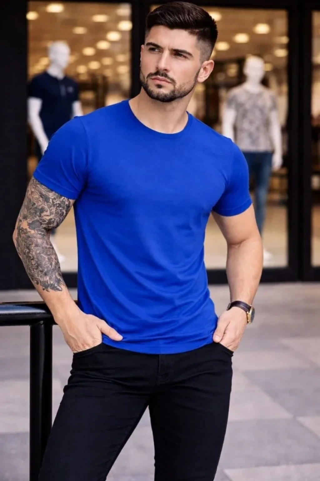 MARSiLYAN- Erkek T-Shirt Bisiklet Yaka Slim Fit Dar Kesim Likralı Tişört Günlük Basic Body - Saks Mavisi