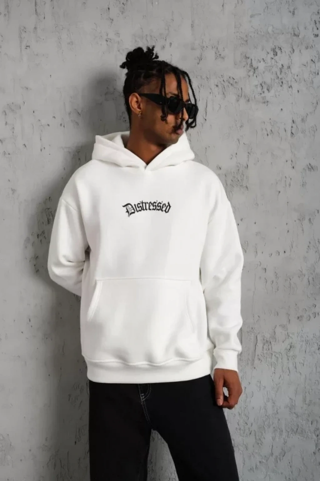 Erkek Üç İplik Baskılı Kapüşonlu Sweat - Beyaz