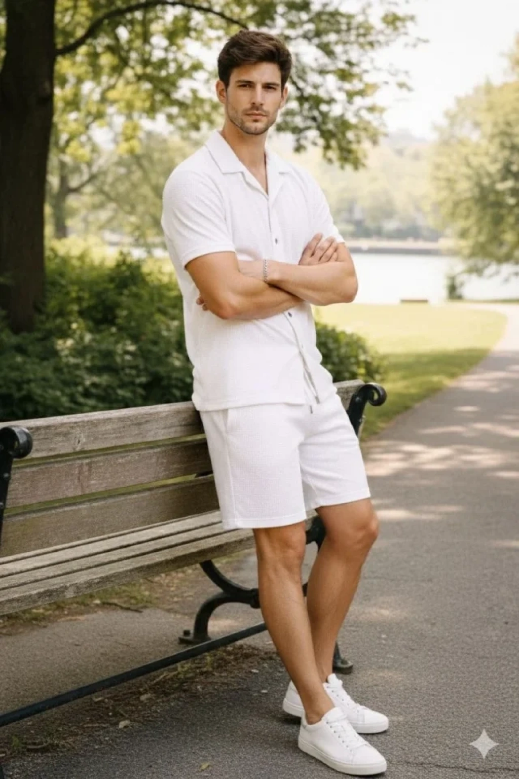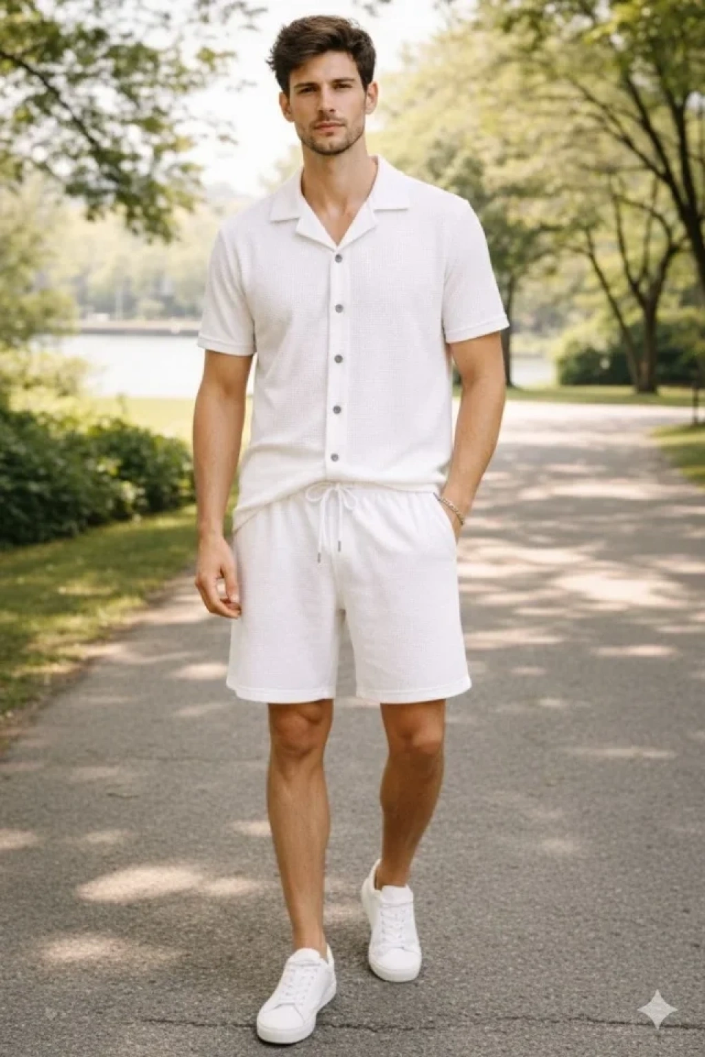 Erkek Waffle Kumaş Kısa Kollu Gömlek Şort Takım Regular Fit Yazlık İkili Set - Beyaz