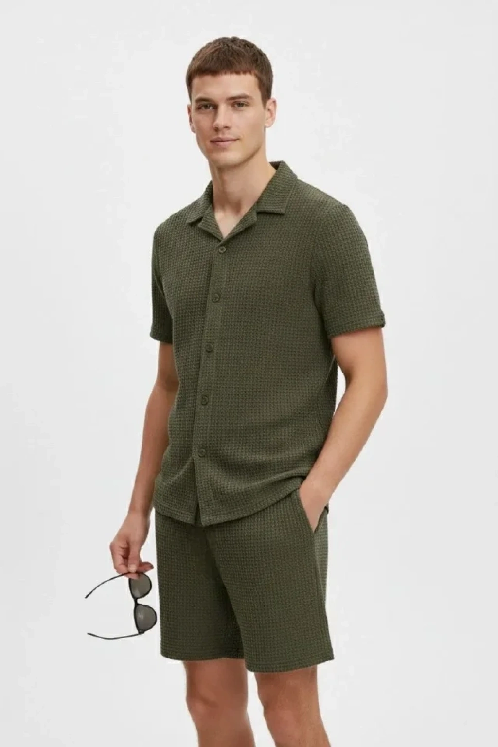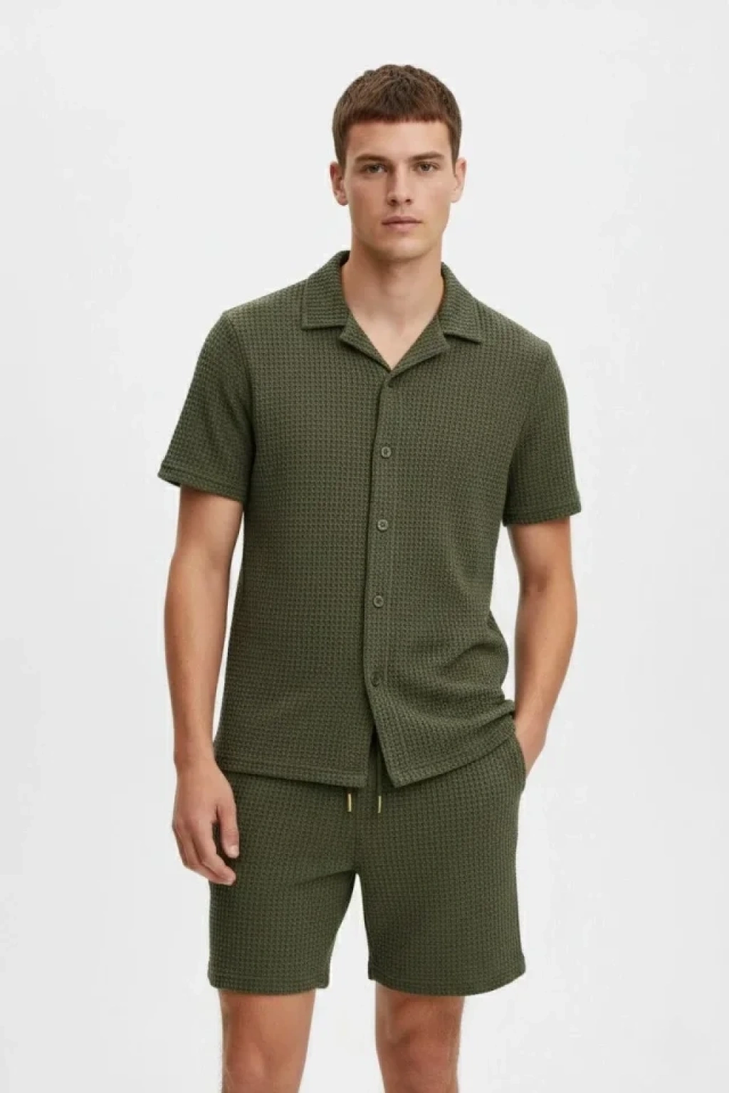 Erkek Waffle Kumaş Kısa Kollu Gömlek Şort Takım Regular Fit Yazlık İkili Set - Haki