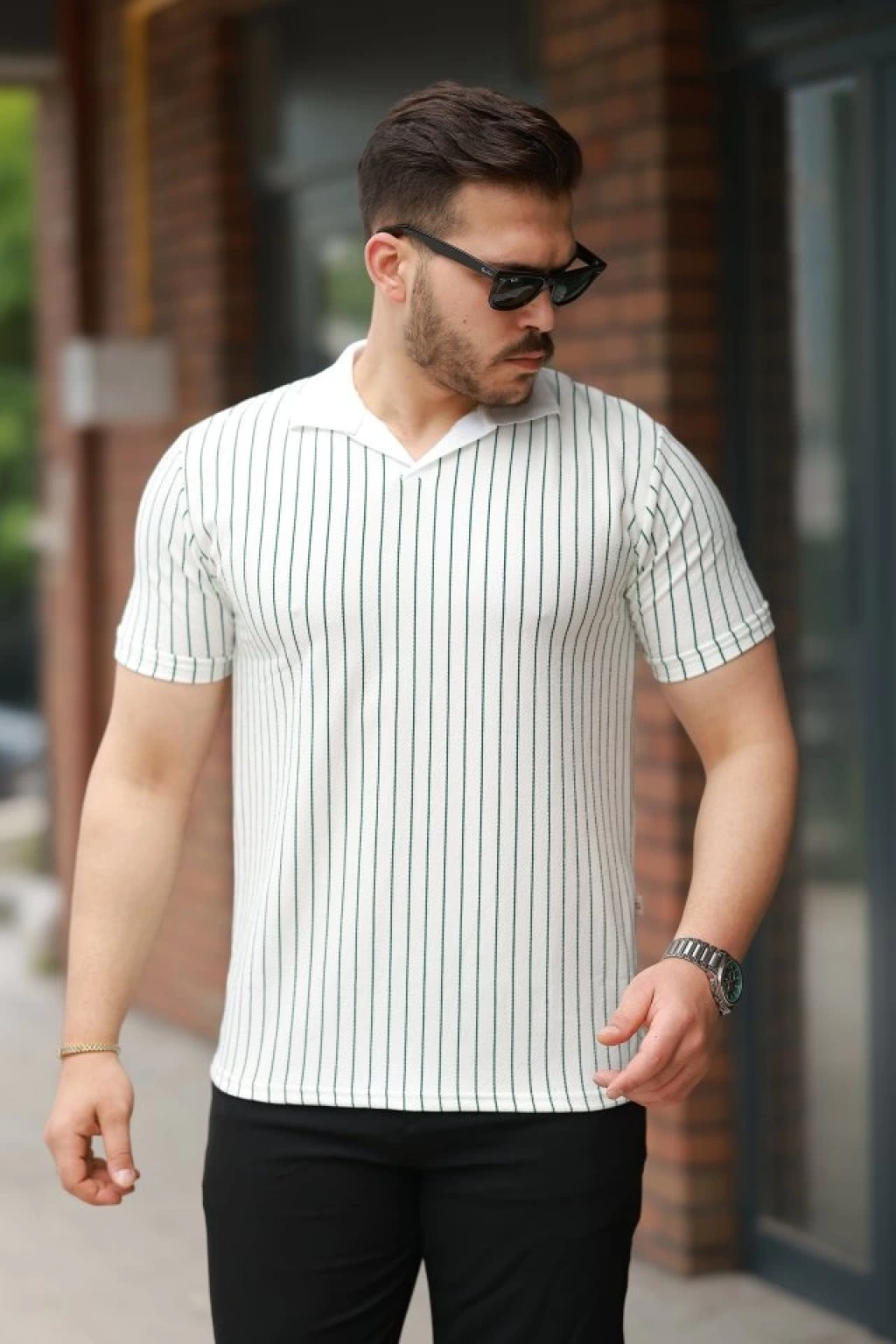 MARSiLYAN- Erkek T-shirt Çizgili Triko Dokuma Kumaş Polo Yaka Yarım Fermuarlı Regular Kalıp Tişört - Çağla Yeşili