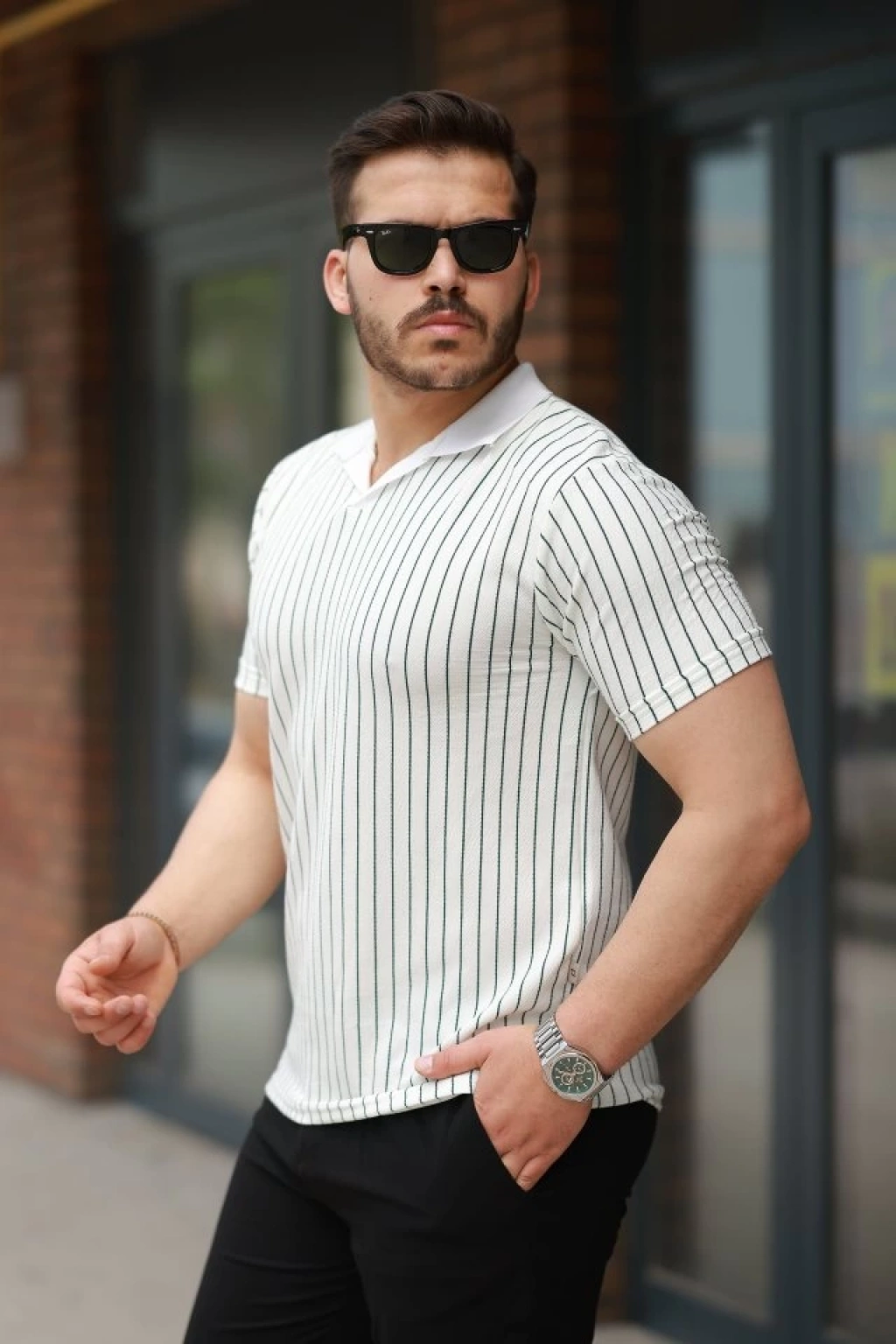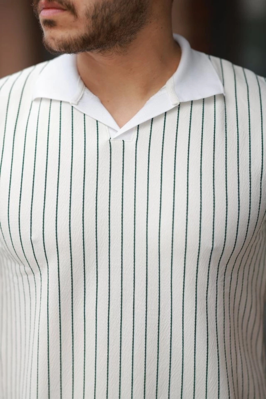 MARSiLYAN- Erkek T-shirt Çizgili Triko Dokuma Kumaş Polo Yaka Yarım Fermuarlı Regular Kalıp Tişört - Beyaz