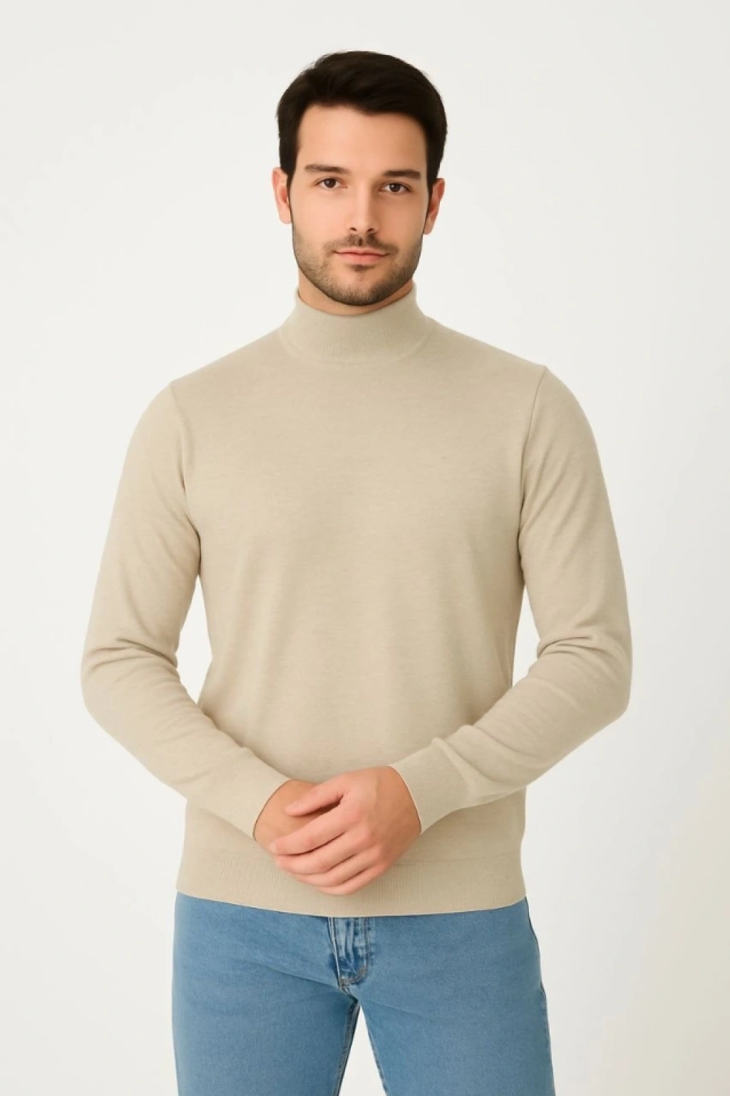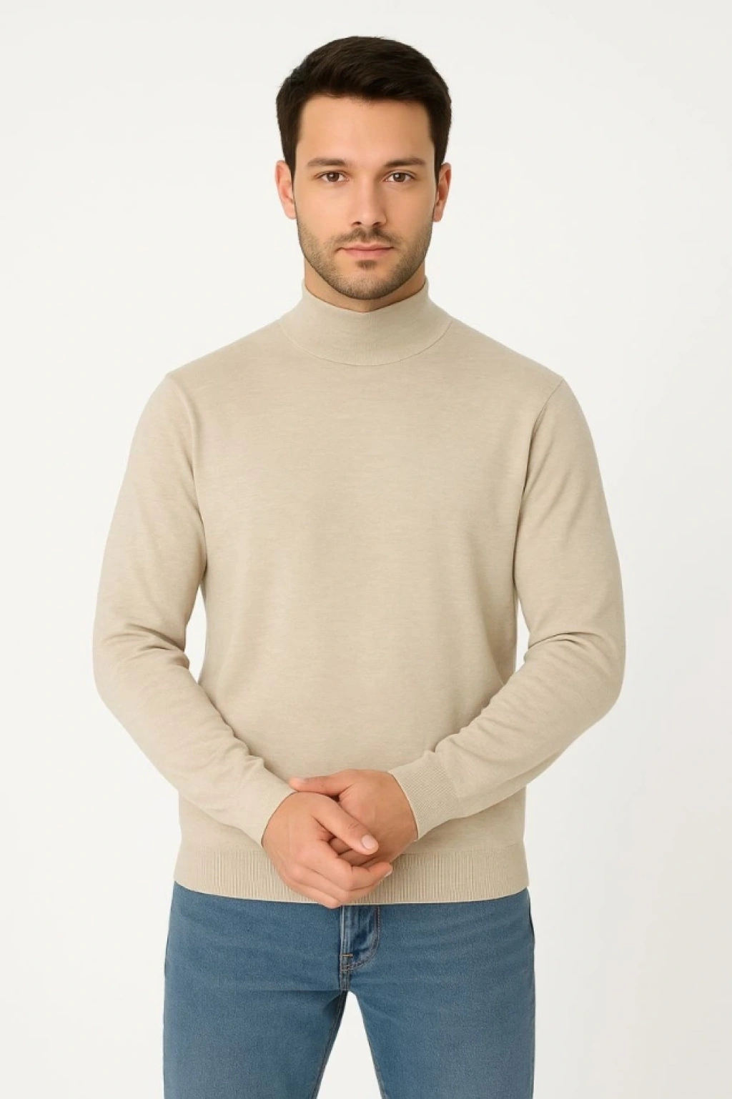 Erkek Yarım Boğaz Triko Kazak Yumuşak Dokulu Pamuklu Ince Dokuma, Uzun Kollu Rahat Regular Kalıp - Bej