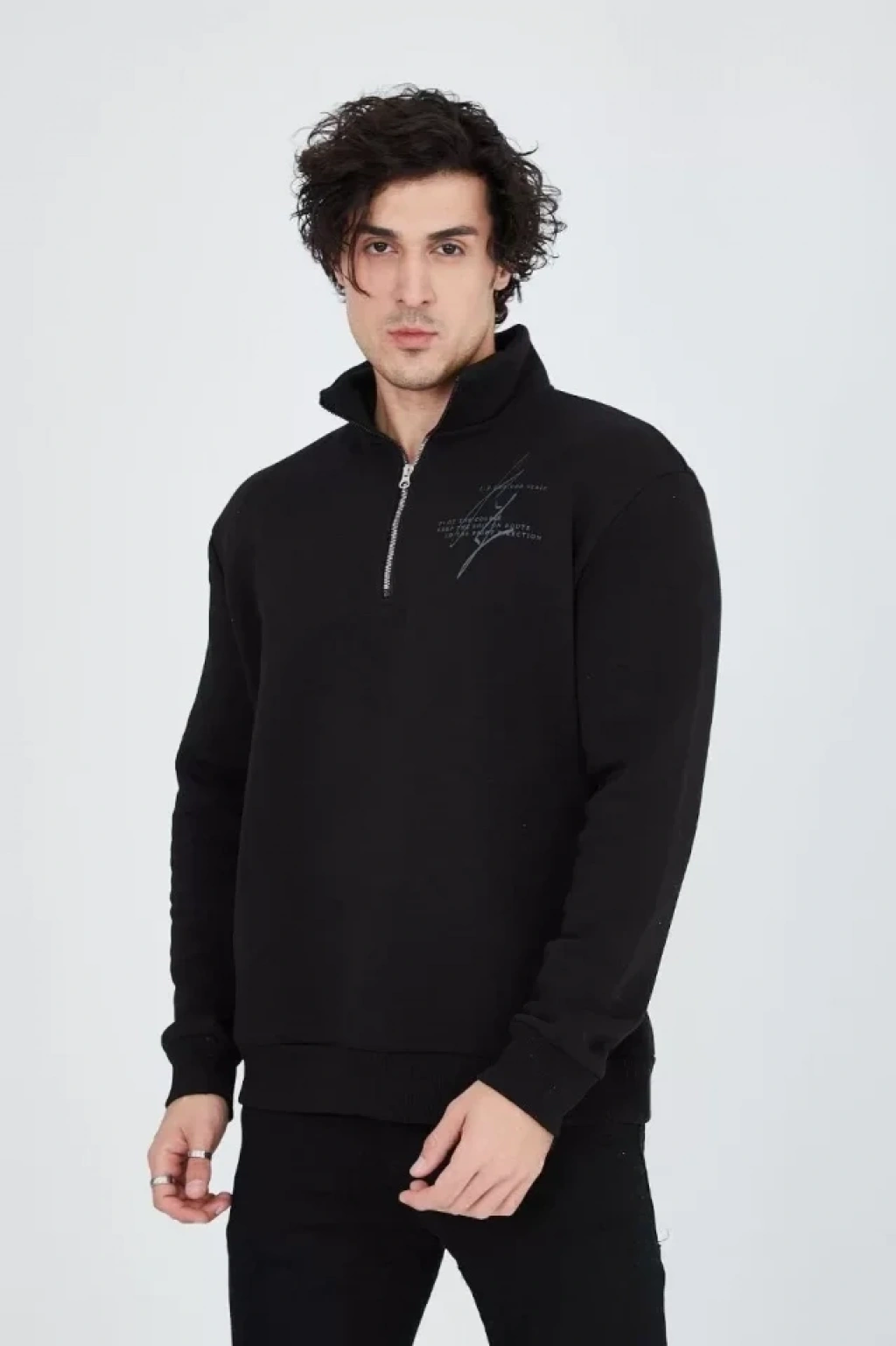 Erkek Yarım Fermuarlı Baskılı Sweat - Siyah