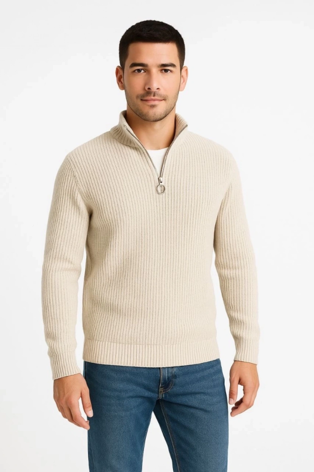 Erkek Yarım Fermuarlı Triko Kazak – Selanik Örgü, Dik Yaka, Pamuklu Dokuma, Regular Fit Uzun Kollu Kışlık Model - Bej